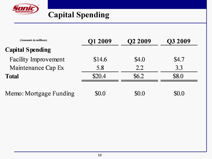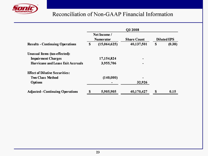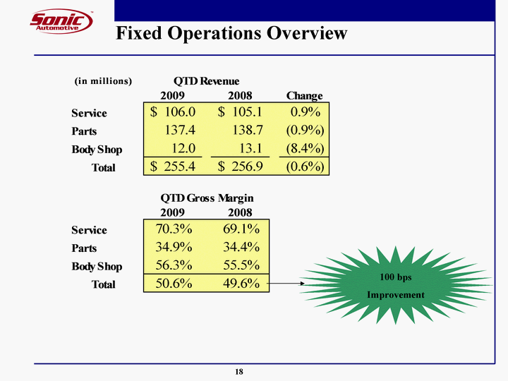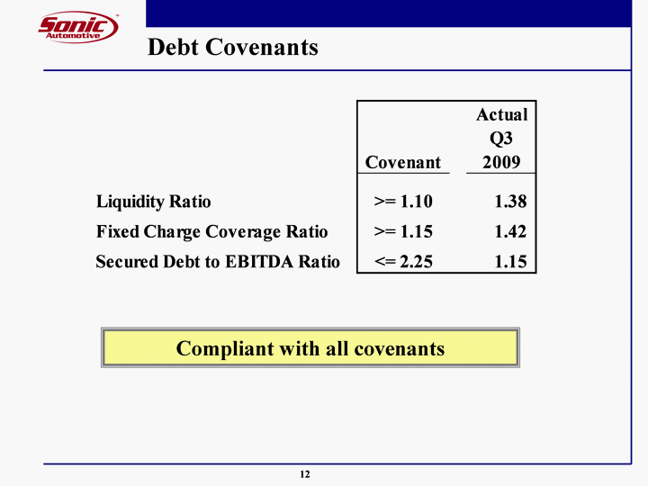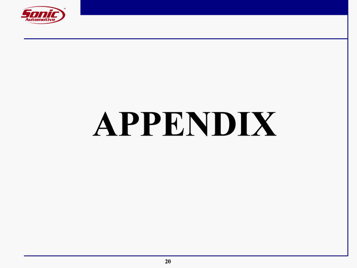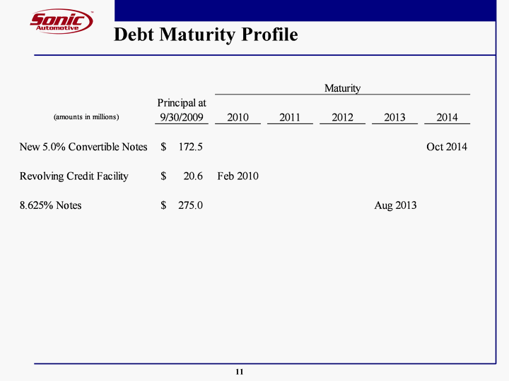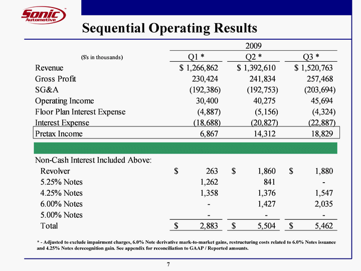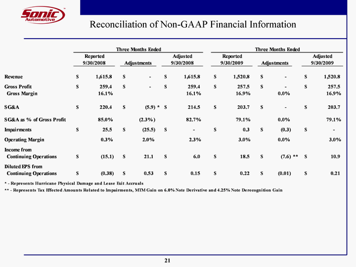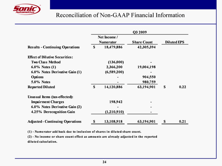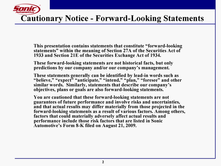 | This presentation contains statements that constitute "forward-looking statements" within the meaning of Section 27A of the Securities Act of 1933 and Section 21E of the Securities Exchange Act of 1934. These forward-looking statements are not historical facts, but only predictions by our company and/or our company's management. These statements generally can be identified by lead-in words such as "believe," "expect" "anticipate," "intend," "plan," "foresee" and other similar words. Similarly, statements that describe our company's objectives, plans or goals are also forward-looking statements. You are cautioned that these forward-looking statements are not guarantees of future performance and involve risks and uncertainties, and that actual results may differ materially from those projected in the forward-looking statements as a result of various factors. Among others, factors that could materially adversely affect actual results and performance include those risk factors that are listed in Sonic Automotive's Form 8-K filed on August 21, 2009. Cautionary Notice - Forward-Looking Statements |