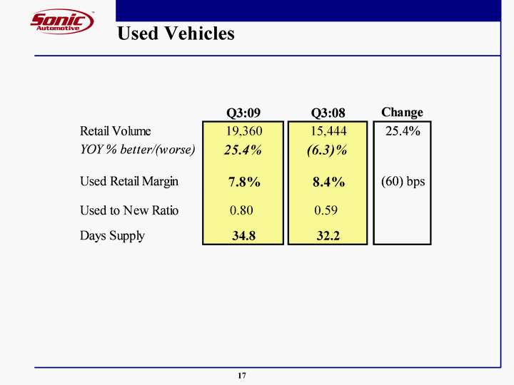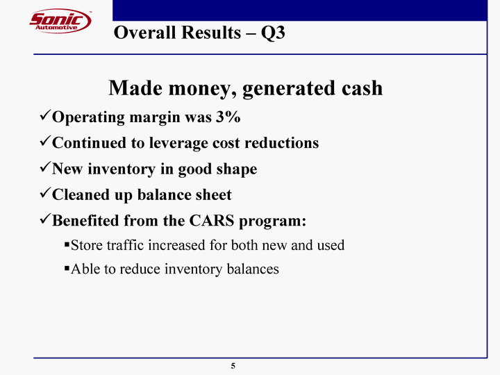 | Overall Results - Q3 Made money, generated cash Operating margin was 3% Continued to leverage cost reductions New inventory in good shape Cleaned up balance sheet Benefited from the CARS program: Store traffic increased for both new and used Able to reduce inventory balances |