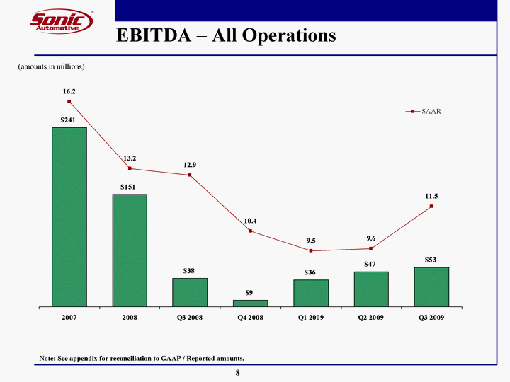 | EBITDA - All Operations (amounts in millions) Stack 1 SAAR Column 3 Column 4 Column 5 Column 6 Column 7 Column 8 Column 9 Column 10 Column 11 Column 12 Column 13 Column 14 Column 15 Column 16 2007 241 16.2 2008 151 13.2 Q3 2008 38 12.9 Q4 2008 9 10.4 Q1 2009 36 9.5 Q2 2009 47 9.6 Q3 2009 53 11.5 Note: See appendix for reconciliation to GAAP / Reported amounts. |