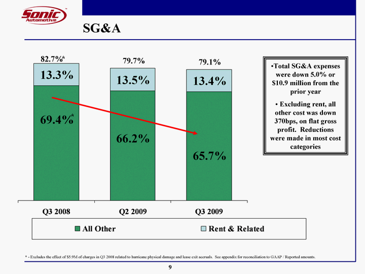 | Q3 2008 Q2 2009 Q3 2009 All Other 0.694 0.662 0.657 Rent & Related 0.133 0.135 0.134 SG&A 79.7% 82.7% 79.1% Total SG&A expenses were down 5.0% or $10.9 million from the prior year Excluding rent, all other cost was down 370bps, on flat gross profit. Reductions were made in most cost categories * - Excludes the effect of $5.9M of charges in Q3 2008 related to hurricane physical damage and lease exit accruals. See appendix for reconciliation to GAAP / Reported amounts. * * |