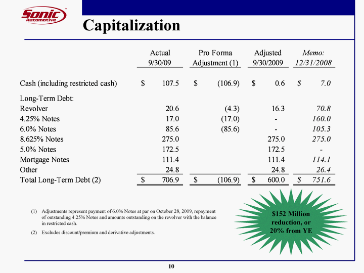 | Capitalization Adjustments represent payment of 6.0% Notes at par on October 28, 2009, repayment of outstanding 4.25% Notes and amounts outstanding on the revolver with the balance in restricted cash. Excludes discount/premium and derivative adjustments. $152 Million reduction, or 20% from YE |