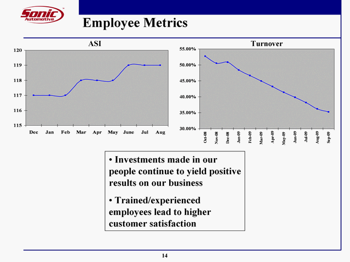 | Employee Metrics Dec Jan Feb Mar Apr May June Jul Aug Engagement 117 117 117 118 118 118 119 119 119 ASI 10/1/2008 11/1/2008 12/1/2008 1/1/2009 2/1/2009 3/1/2009 4/1/2009 5/1/2009 6/1/2009 7/1/2009 8/1/2009 9/1/2009 Turnover 0.527 0.505 0.508 0.484 0.467 0.449 0.432 0.414 0.398 0.382 0.362 0.353 Turnover Investments made in our people continue to yield positive results on our business Trained/experienced employees lead to higher customer satisfaction |
