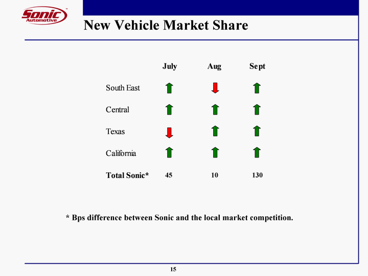 | New Vehicle Market Share * Bps difference between Sonic and the local market competition. 130 10 45 |