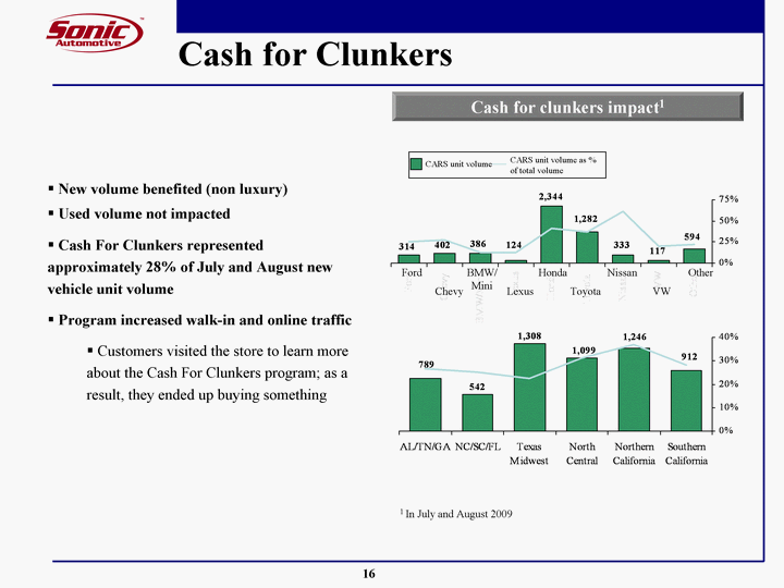 | Cash for Clunkers New volume benefited (non luxury) Used volume not impacted Cash For Clunkers represented approximately 28% of July and August new vehicle unit volume Program increased walk-in and online traffic Customers visited the store to learn more about the Cash For Clunkers program; as a result, they ended up buying something Cash for clunkers impact1 Ford Chevy Cadillac BMW/Mini Lexus Mercedes Honda Toyota Nissan VW Other CARS volume 314 402 1 386 124 2 2344 1282 333 117 594 CARS volume % total volume 0.252 0.271 0.002 0.13 0.132 0.002 0.417 0.368 0.614 0.201 0.226 AL/TN/GA NC/SC/FL Texas Midwest North Central Northern California Southern California CARS volume 789 542 1308 1099 1246 912 546 419 20 26 CARS volume % total volume 0.267 0.25 0.226 0.314 0.368 0.283 0.248 0.266 0.078 0.098 CARS unit volume CARS unit volume as % of total volume Ford Chevy BMW/ Mini Lexus Honda Toyota Nissan VW Other 1 In July and August 2009 |