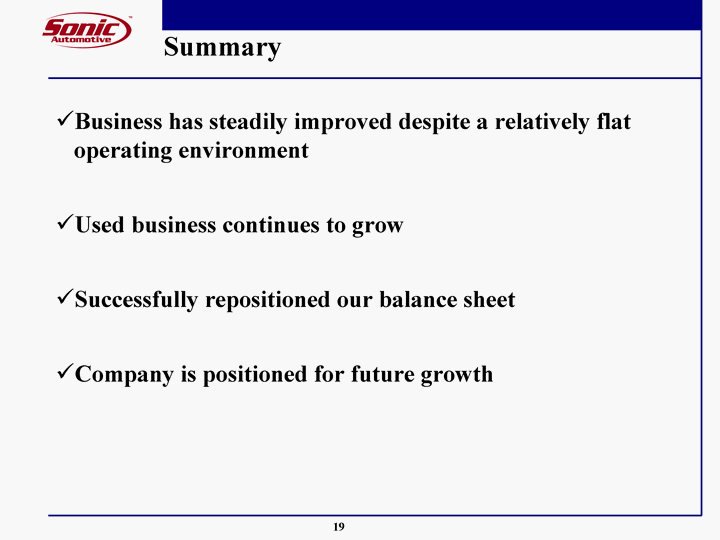 | Summary Business has steadily improved despite a relatively flat operating environment Used business continues to grow Successfully repositioned our balance sheet Company is positioned for future growth |
