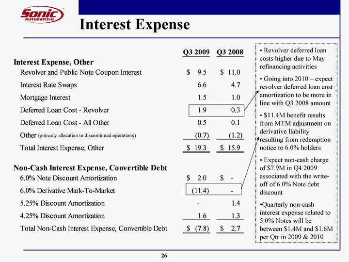 | Interest Expense Revolver deferred loan costs higher due to May refinancing activities Going into 2010 - expect revolver deferred loan cost amortization to be more in line with Q3 2008 amount $11.4M benefit results from MTM adjustment on derivative liability resulting from redemption notice to 6.0% holders Expect non-cash charge of $7.9M in Q4 2009 associated with the write- off of 6.0% Note debt discount Quarterly non-cash interest expense related to 5.0% Notes will be between $1.4M and $1.6M per Qtr in 2009 & 2010 |