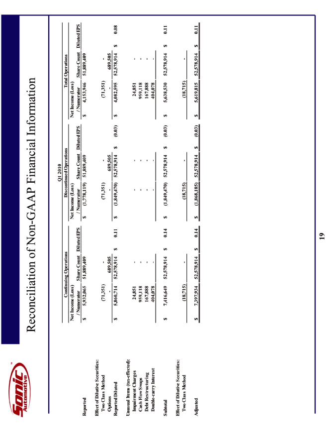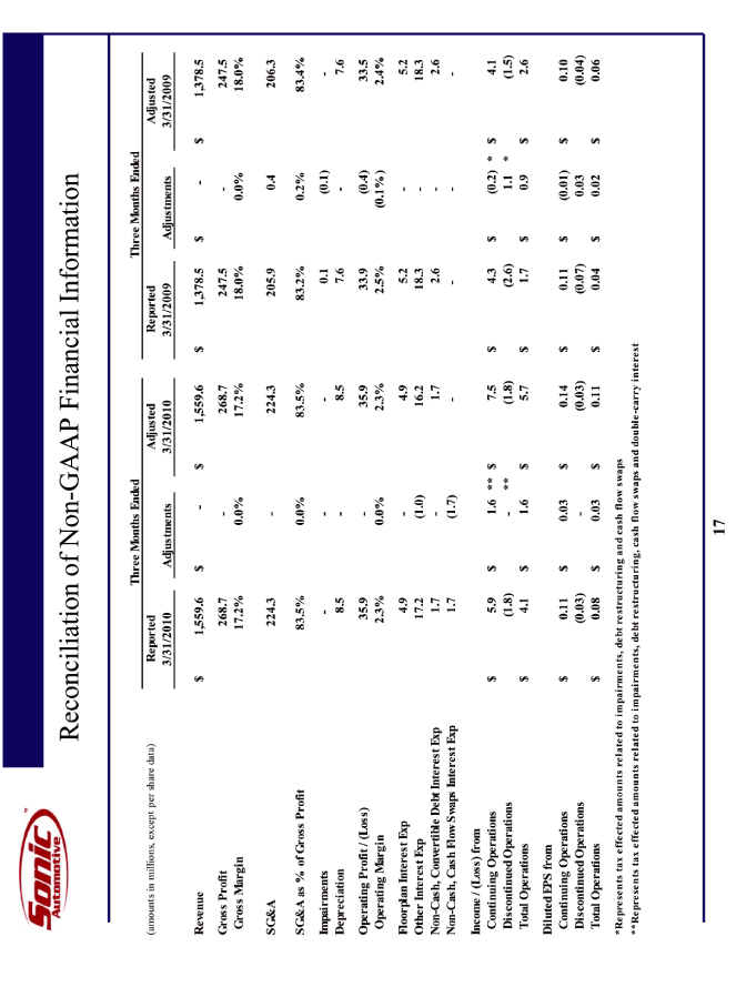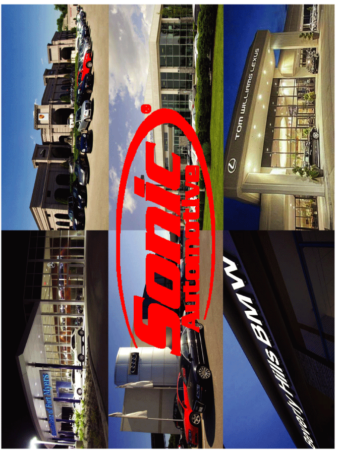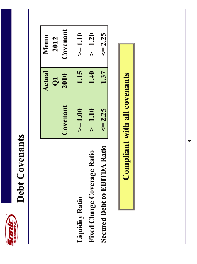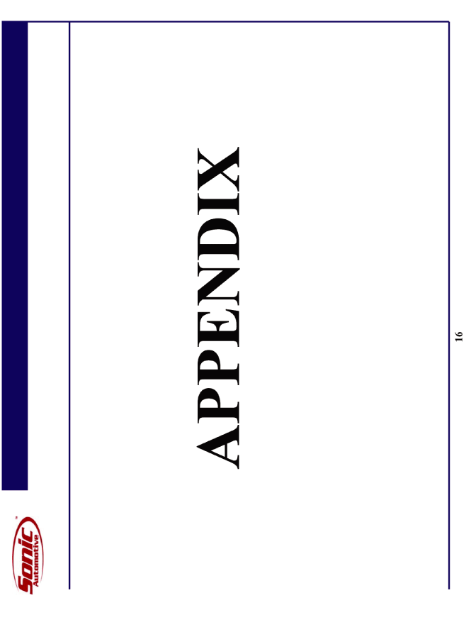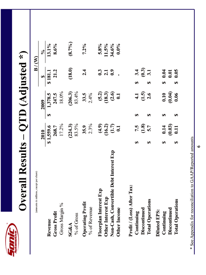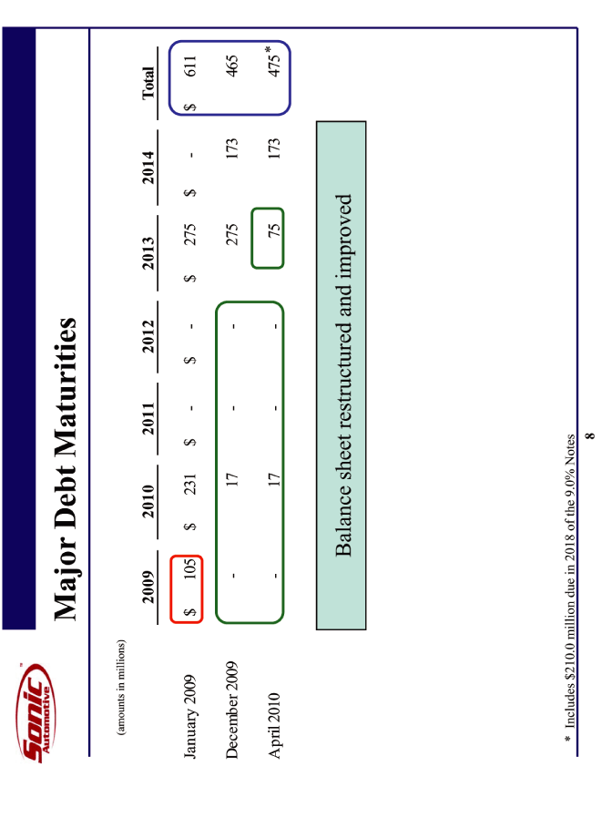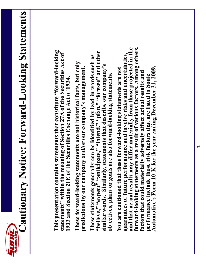 | This presentation contains statements that constitute "forward-looking statements" within the meaning of Section 27A of the Securities Act of 1933 and Section 21E of the Securities Exchange Act of 1934. These forward-looking statements are not historical facts, but only predictions by our company and/or our company's management. These statements generally can be identified by lead-in words such as "believe," "expect" "anticipate," "intend," "plan," "foresee" and other similar words. Similarly, statements that describe our company's objectives, plans or goals are also forward-looking statements. You are cautioned that these forward-looking statements are not guarantees of future performance and involve risks and uncertainties, and that actual results may differ materially from those projected in the forward-looking statements as a result of various factors. Among others, factors that could materially adversely affect actual results and performance include those risk factors that are listed in Sonic Automotive's Form 10-K for the year ending December 31, 2009. Cautionary Notice: Forward-Looking Statements |