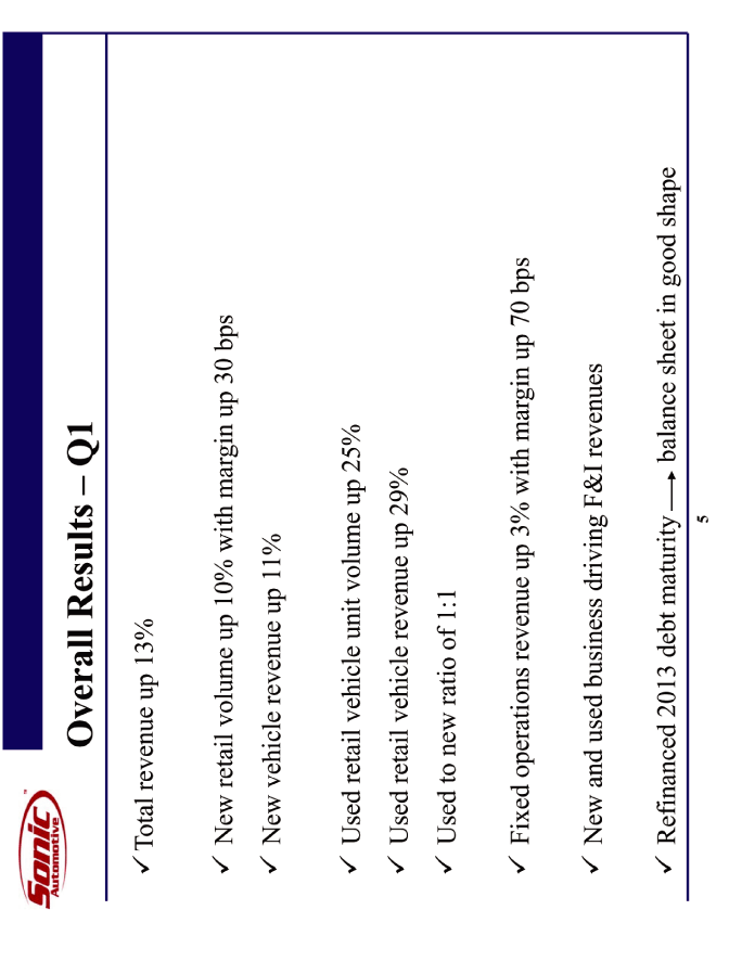 | Overall Results - Q1 Total revenue up 13% New retail volume up 10% with margin up 30 bps New vehicle revenue up 11% Used retail vehicle unit volume up 25% Used retail vehicle revenue up 29% Used to new ratio of 1:1 Fixed operations revenue up 3% with margin up 70 bps New and used business driving F&I revenues Refinanced 2013 debt maturity balance sheet in good shape |