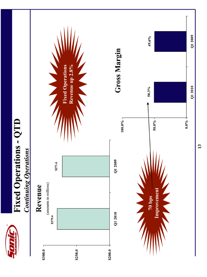 | Fixed Operations - QTD Continuing Operations Q1 2010 Q1 2009 279.4 271.6 Revenue (amounts in millions) Q1 2010 Q1 2009 0.503 0.496 Gross Margin 70 bps Improvement Fixed Operations Revenue up 2.8% |