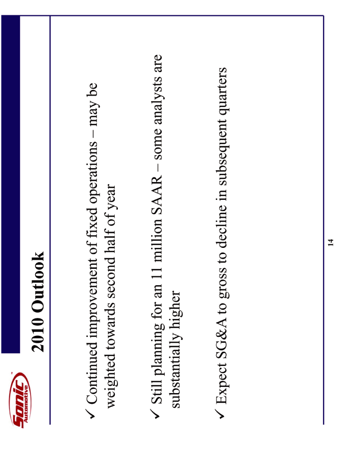 | 2010 Outlook Continued improvement of fixed operations - may be weighted towards second half of year Still planning for an 11 million SAAR - some analysts are substantially higher Expect SG&A to gross to decline in subsequent quarters |