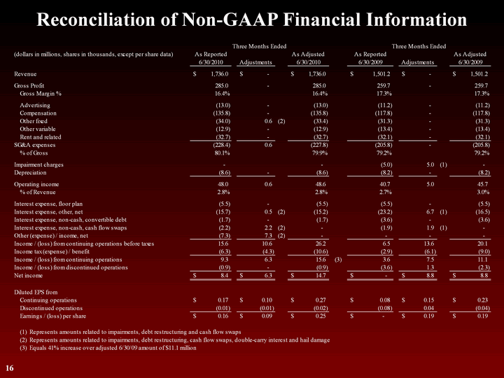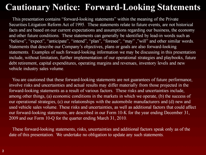 | 2 Cautionary Notice: Forward-Looking Statements This presentation contains "forward-looking statements" within the meaning of the Private Securities Litigation Reform Act of 1995. These statements relate to future events, are not historical facts and are based on our current expectations and assumptions regarding our business, the economy and other future conditions. These statements can generally be identified by lead-in words such as "believe", "expect", "anticipate", "intend", "plan", "foresee", "may" ,"will" and other similar words. Statements that describe our Company's objectives, plans or goals are also forward-looking statements. Examples of such forward-looking information we may be discussing in this presentation include, without limitation, further implementation of our operational strategies and playbooks, future debt retirement, capital expenditures, operating margins and revenues, inventory levels and new vehicle industry sales volume. You are cautioned that these forward-looking statements are not guarantees of future performance, involve risks and uncertainties and actual results may differ materially from those projected in the forward-looking statements as a result of various factors. These risks and uncertainties include, among other things, (a) economic conditions in the markets in which we operate, (b) the success of our operational strategies, (c) our relationships with the automobile manufacturers and (d) new and used vehicle sales volume. These risks and uncertainties, as well as additional factors that could affect our forward-looking statements, are described in our Form 10-K for the year ending December 31, 2009 and our Form 10-Q for the quarter ending March 31, 2010. These forward-looking statements, risks, uncertainties and additional factors speak only as of the date of this presentation. We undertake no obligation to update any such statements. |