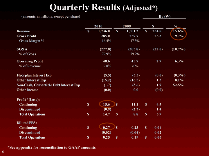 | 4 Overall Results - Q2 2010 Continuing operations adjusted profit up 41%* Total revenue up 16% New retail volume up 15% with new retail vehicle revenue up 19% Introducing new vehicle Playbook in Q3 Used retail vehicle unit volume up 20% on top of prior year 12% increase Fixed operations revenue up 5% Customer pay revenue continues to increase *See appendix for reconciliation to GAAP amounts. |
