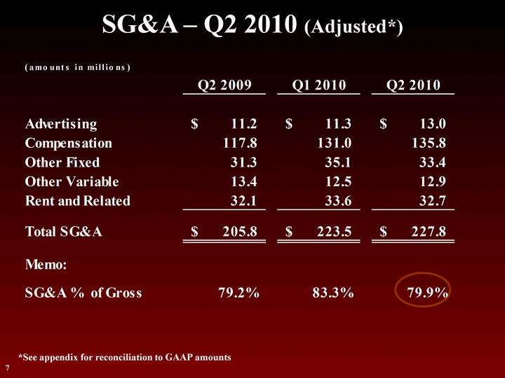 | 7 SG&A - Q2 2010 (Adjusted*) *See appendix for reconciliation to GAAP amounts |