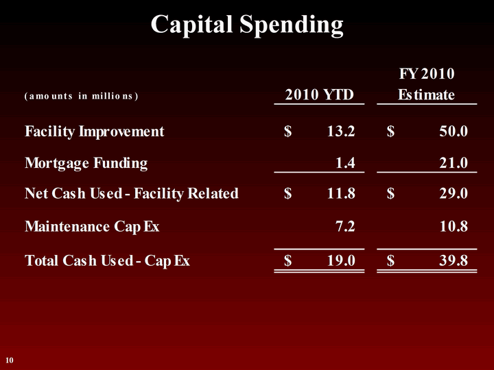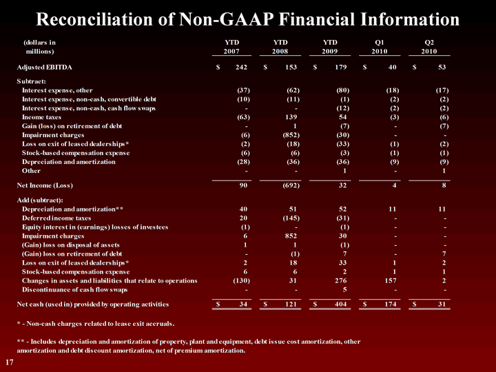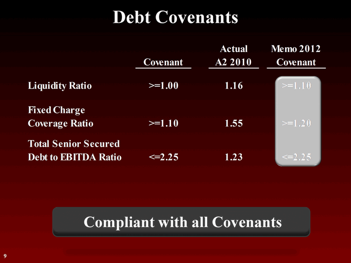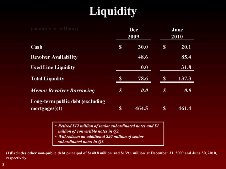 | 8 Liquidity (1)Excludes other non-public debt principal of $140.8 million and $139.1 million at December 31, 2009 and June 30, 2010, respectively. Retired $12 million of senior subordinated notes and $1 million of convertible notes in Q2. Will redeem an additional $20 million of senior subordinated notes in Q3. |