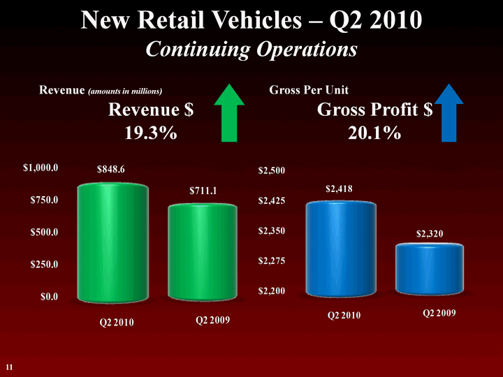 | 11 New Retail Vehicles - Q2 2010 Continuing Operations Revenue (amounts in millions) Revenue $ 19.3% Gross Per Unit Gross Profit $ 20.1% |