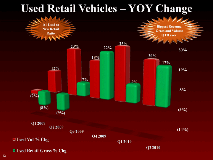 | 12 Used Retail Vehicles - YOY Change 1:1 Used to New Retail Ratio Biggest Revenue, Gross and Volume QTR ever! 30% 19% 8% (3%) (14%) |