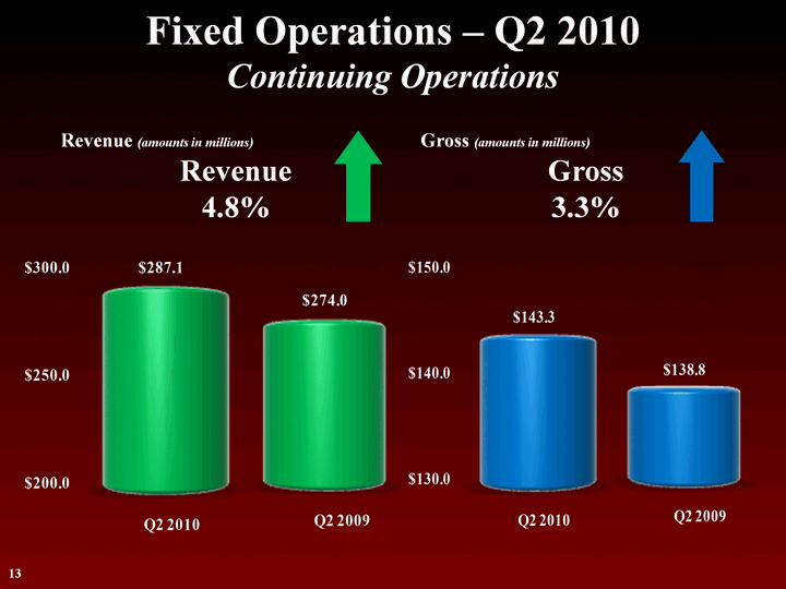 | 13 Fixed Operations - Q2 2010 Continuing Operations Revenue (amounts in millions) Revenue 4.8% Gross (amounts in millions) Gross 3.3% |