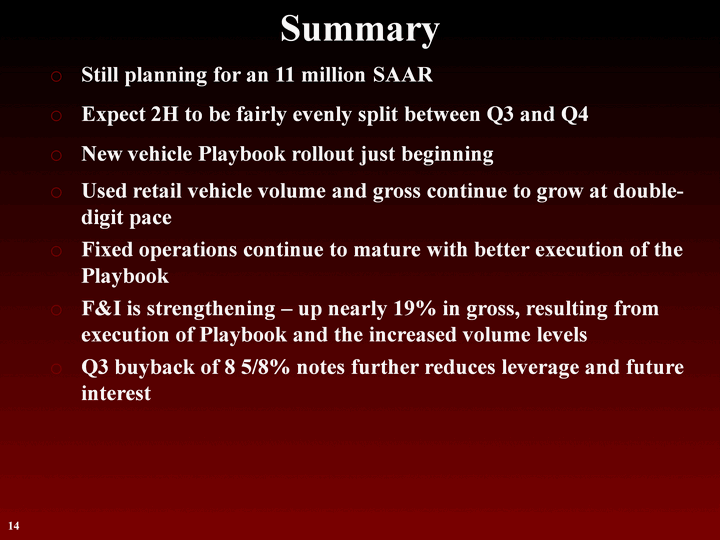 | 14 Still planning for an 11 million SAAR Expect 2H to be fairly evenly split between Q3 and Q4 New vehicle Playbook rollout just beginning Used retail vehicle volume and gross continue to grow at double- digit pace Fixed operations continue to mature with better execution of the Playbook F&I is strengthening - up nearly 19% in gross, resulting from execution of Playbook and the increased volume levels Q3 buyback of 8 5/8% notes further reduces leverage and future interest Summary |