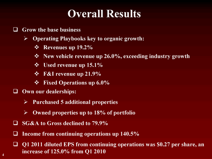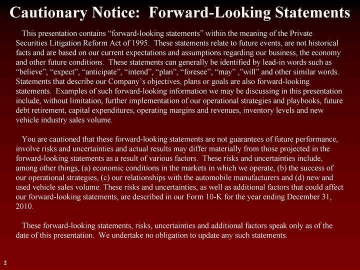 | 2 Cautionary Notice: Forward-Looking Statements This presentation contains "forward-looking statements" within the meaning of the Private Securities Litigation Reform Act of 1995. These statements relate to future events, are not historical facts and are based on our current expectations and assumptions regarding our business, the economy and other future conditions. These statements can generally be identified by lead-in words such as "believe", "expect", "anticipate", "intend", "plan", "foresee", "may" ,"will" and other similar words. Statements that describe our Company's objectives, plans or goals are also forward-looking statements. Examples of such forward-looking information we may be discussing in this presentation include, without limitation, further implementation of our operational strategies and playbooks, future debt retirement, capital expenditures, operating margins and revenues, inventory levels and new vehicle industry sales volume. You are cautioned that these forward-looking statements are not guarantees of future performance, involve risks and uncertainties and actual results may differ materially from those projected in the forward-looking statements as a result of various factors. These risks and uncertainties include, among other things, (a) economic conditions in the markets in which we operate, (b) the success of our operational strategies, (c) our relationships with the automobile manufacturers and (d) new and used vehicle sales volume. These risks and uncertainties, as well as additional factors that could affect our forward-looking statements, are described in our Form 10-K for the year ending December 31, 2010. These forward-looking statements, risks, uncertainties and additional factors speak only as of the date of this presentation. We undertake no obligation to update any such statements. |
