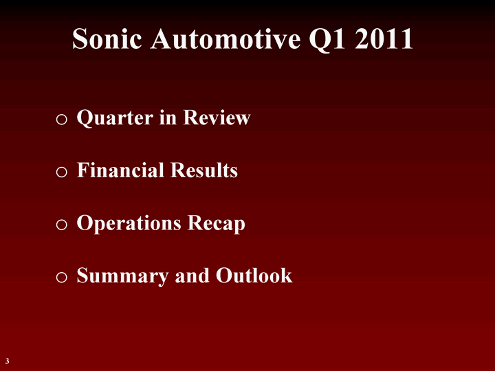 | 3 Sonic Automotive Q1 2011 Quarter in Review Financial Results Operations Recap Summary and Outlook |