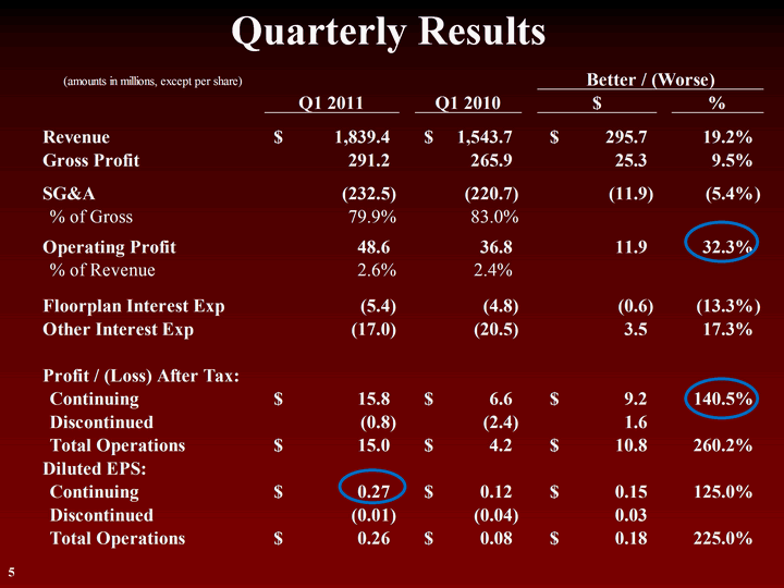 | 4 Overall Results Grow the base business Operating Playbooks key to organic growth: Revenues up 19.2% New vehicle revenue up 26.0%, exceeding industry growth Used revenue up 15.1% F&I revenue up 21.9% Fixed Operations up 6.0% Own our dealerships: Purchased 5 additional properties Owned properties up to 18% of portfolio SG&A to Gross declined to 79.9% Income from continuing operations up 140.5% Q1 2011 diluted EPS from continuing operations was $0.27 per share, an increase of 125.0% from Q1 2010 |