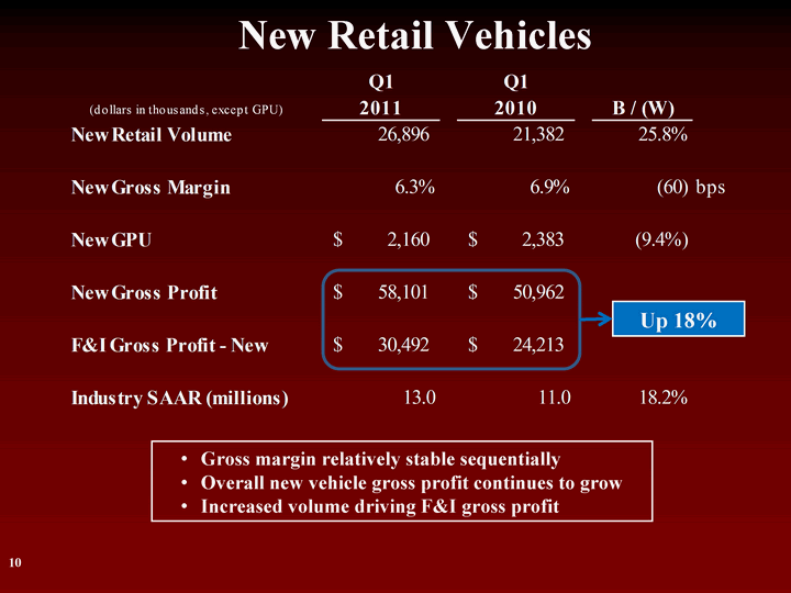 | New Retail Vehicles 10 Gross margin relatively stable sequentially Overall new vehicle gross profit continues to grow Increased volume driving F&I gross profit Up 18% |