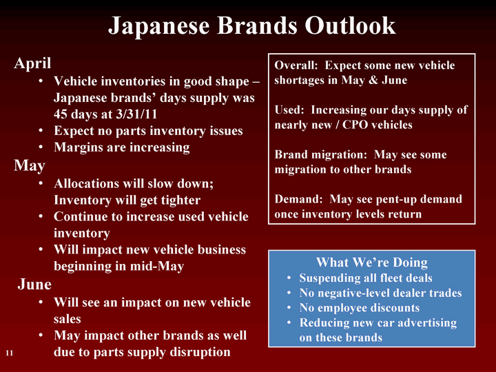 | Japanese Brands Outlook April Vehicle inventories in good shape - Japanese brands' days supply was 45 days at 3/31/11 Expect no parts inventory issues Margins are increasing May Allocations will slow down; Inventory will get tighter Continue to increase used vehicle inventory Will impact new vehicle business beginning in mid-May June Will see an impact on new vehicle sales May impact other brands as well due to parts supply disruption Overall: Expect some new vehicle shortages in May & June Used: Increasing our days supply of nearly new / CPO vehicles Brand migration: May see some migration to other brands Demand: May see pent-up demand once inventory levels return What We're Doing Suspending all fleet deals No negative-level dealer trades No employee discounts Reducing new car advertising on these brands 11 |