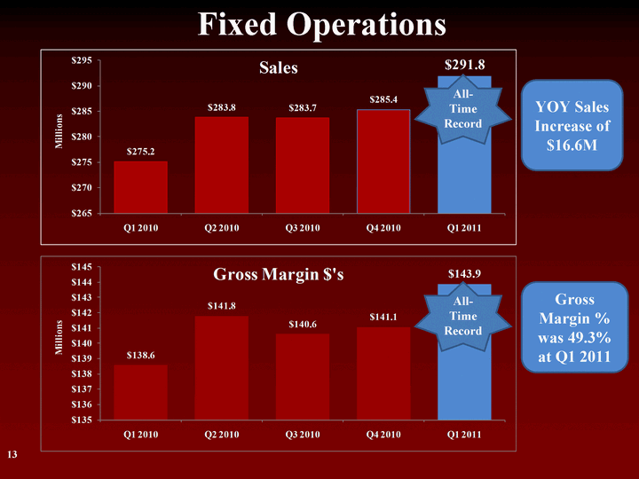 | Fixed Operations YOY Sales Increase of $16.6M Gross Margin % was 49.3% at Q1 2011 13 All- Time Record All- Time Record |