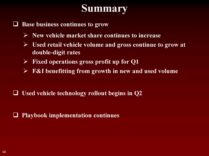 | 14 Summary Base business continues to grow New vehicle market share continues to increase Used retail vehicle volume and gross continue to grow at double-digit rates Fixed operations gross profit up for Q1 F&I benefitting from growth in new and used volume Used vehicle technology rollout begins in Q2 Playbook implementation continues |
