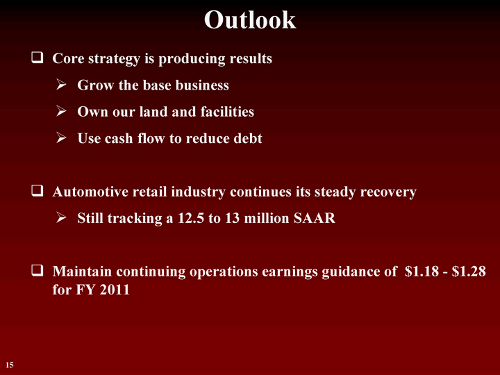| 15 Outlook Core strategy is producing results Grow the base business Own our land and facilities Use cash flow to reduce debt Automotive retail industry continues its steady recovery Still tracking a 12.5 to 13 million SAAR Maintain continuing operations earnings guidance of $1.18 - $1.28 for FY 2011 |