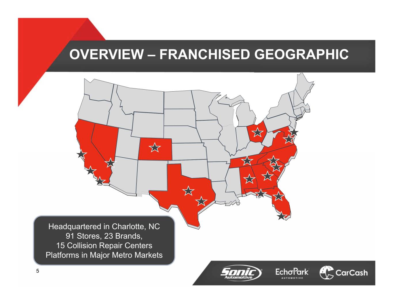 OVERVIEW – FRANCHISED GEOGRAPHIC Headquartered in Charlotte, NC 91 Stores, 23 Brands, 15 Collision Repair Centers Platforms in Major Metro Markets 5