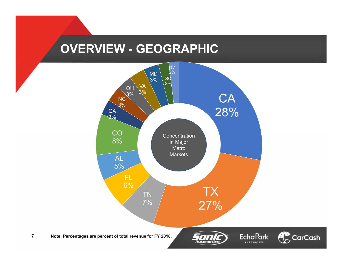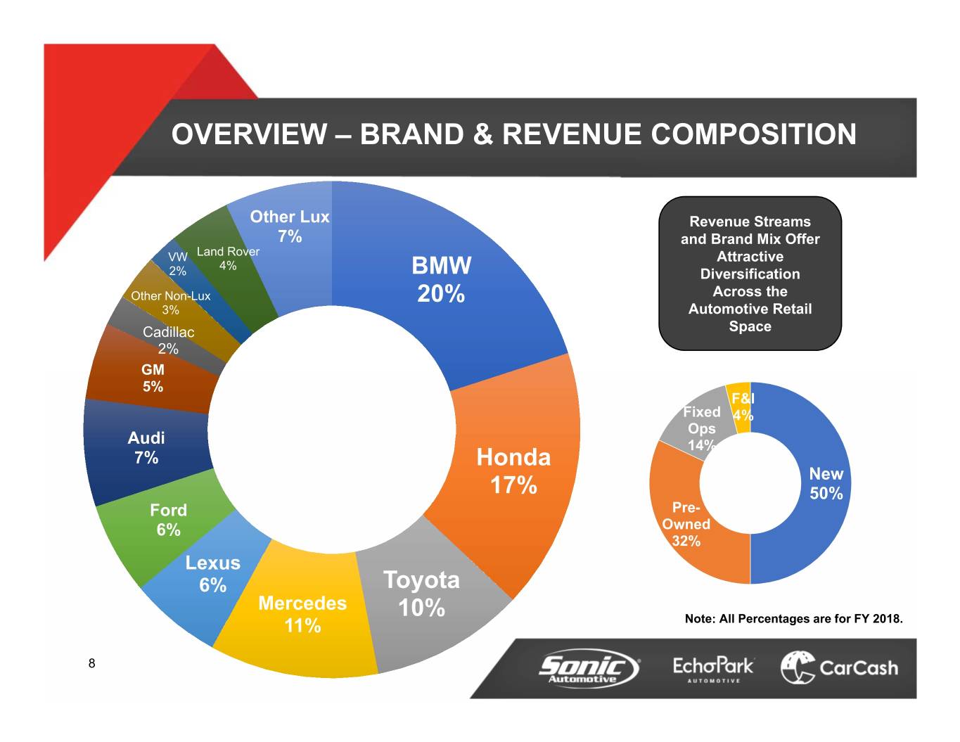 OVERVIEW - GEOGRAPHIC NV MD 2% 3% SC 2% OH VA 3% 3% NC CA 3% GA 3% 28% CO Concentration 8% in Major Metro Markets AL 5% FL 6% TN TX 7% 27% 7 Note: Percentages are percent of total revenue for FY 2018.
