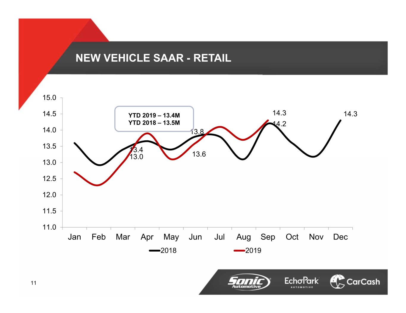 NEW VEHICLE SAAR - RETAIL 15.0 14.5 YTD 2019 – 13.4M 14.3 14.3 YTD 2018 – 13.5M 14.2 14.0 13.8 13.5 13.4 13.0 13.6 13.0 12.5 12.0 11.5 11.0 Jan Feb Mar Apr May Jun Jul Aug Sep Oct Nov Dec 2018 2019 11