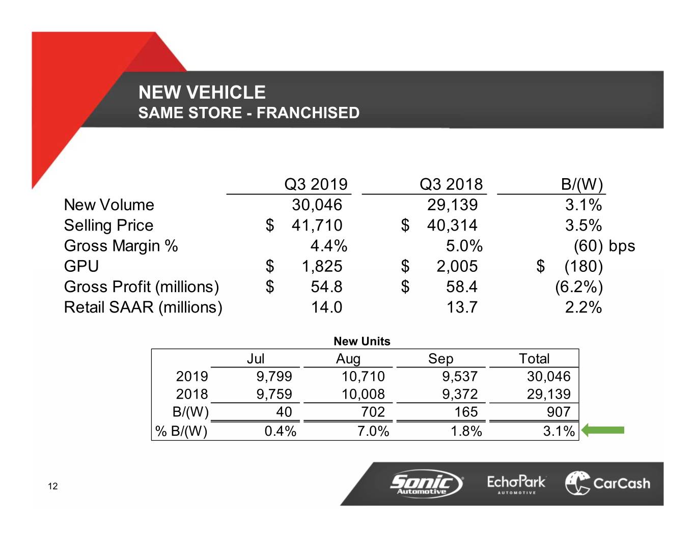 NEW VEHICLE SAME STORE - FRANCHISED Q3 2019 Q3 2018 B/(W) New Volume 30,046 29,139 3.1% Selling Price$ 41,710 $ 40,314 3.5% Gross Margin % 4.4% 5.0% (60) bps GPU$ 1,825 $ 2,005 $ (180) Gross Profit (millions)$ 54.8 $ 58.4 (6.2%) Retail SAAR (millions) 14.0 13.7 2.2% New Units Jul Aug Sep Total 2019 9,799 10,710 9,537 30,046 2018 9,759 10,008 9,372 29,139 B/(W) 40 702 165 907 % B/(W) 0.4% 7.0% 1.8% 3.1% 12