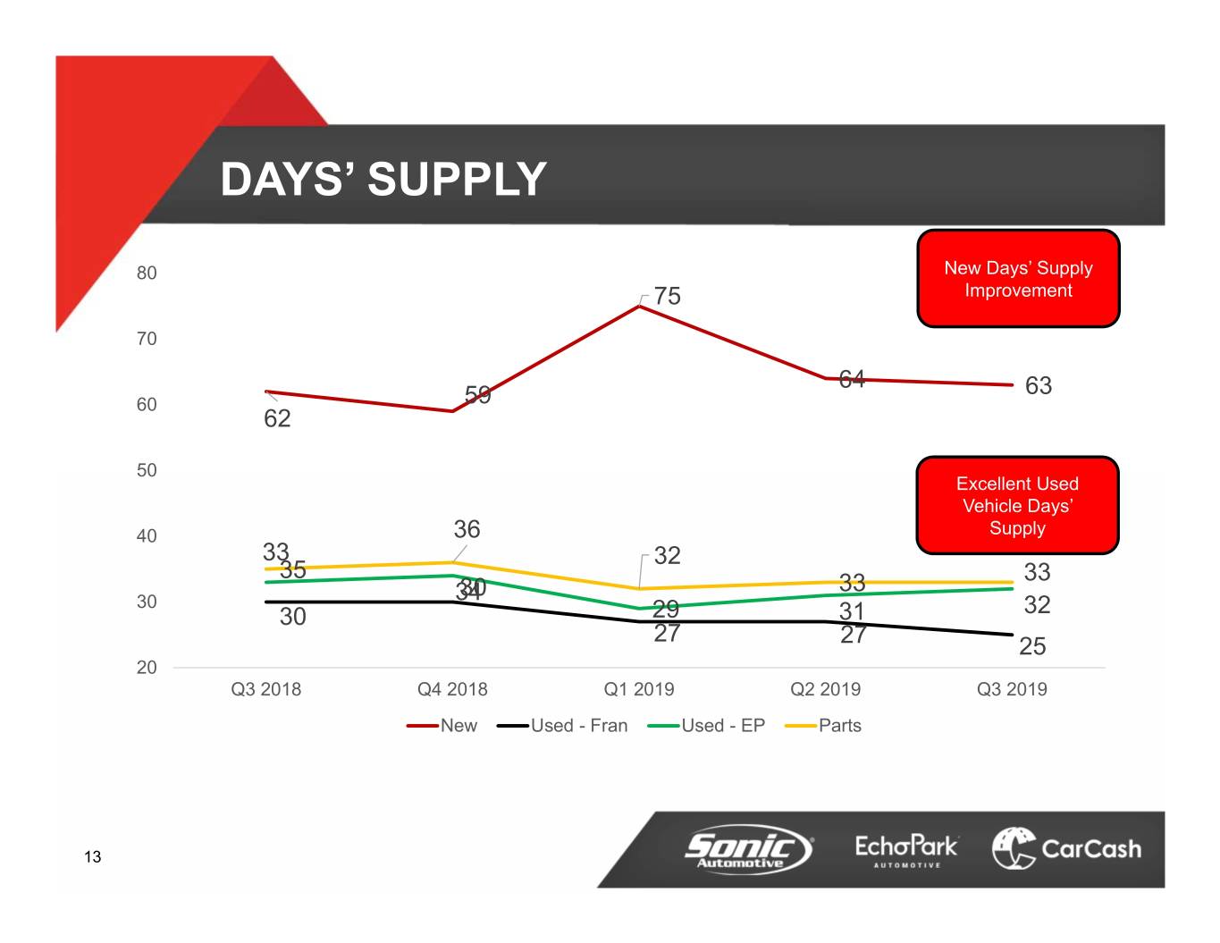 USED VEHICLE RETAIL Franchised – Same Store Q3 2019 Q3 2018 B/(W) Retail Volume 29,050 26,067 11.4% GPU$ 1,235 $ 1,330 $ (95) Used to New Ratio 97% 89% 800 bps Vehicles/Store/Month (90 stores) 108 97 11 Front End Gross and F&I (in millions) Jul Aug Sep Total 2019$ 26.9 $ 28.0 $ 27.1 $ 82.0 2018 24.3 24.6 22.7 71.6 B/(W)$ 2.6 $ 3.4 $ 4.4 $ 10.4 14