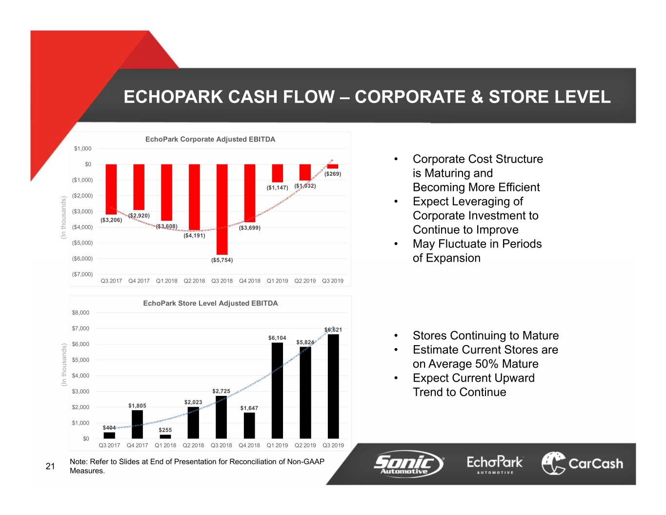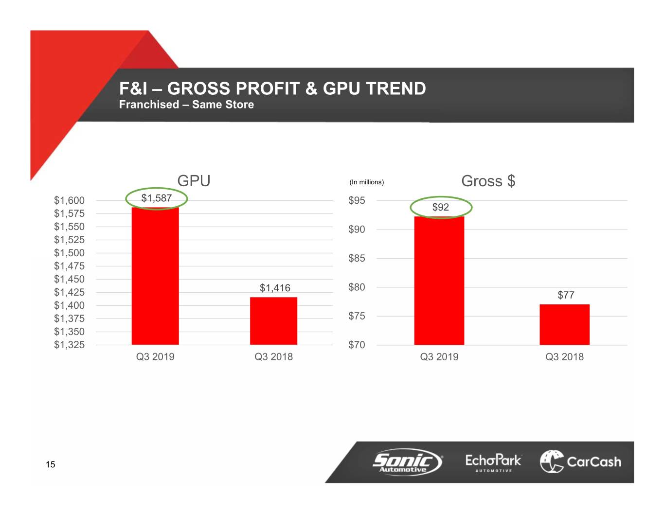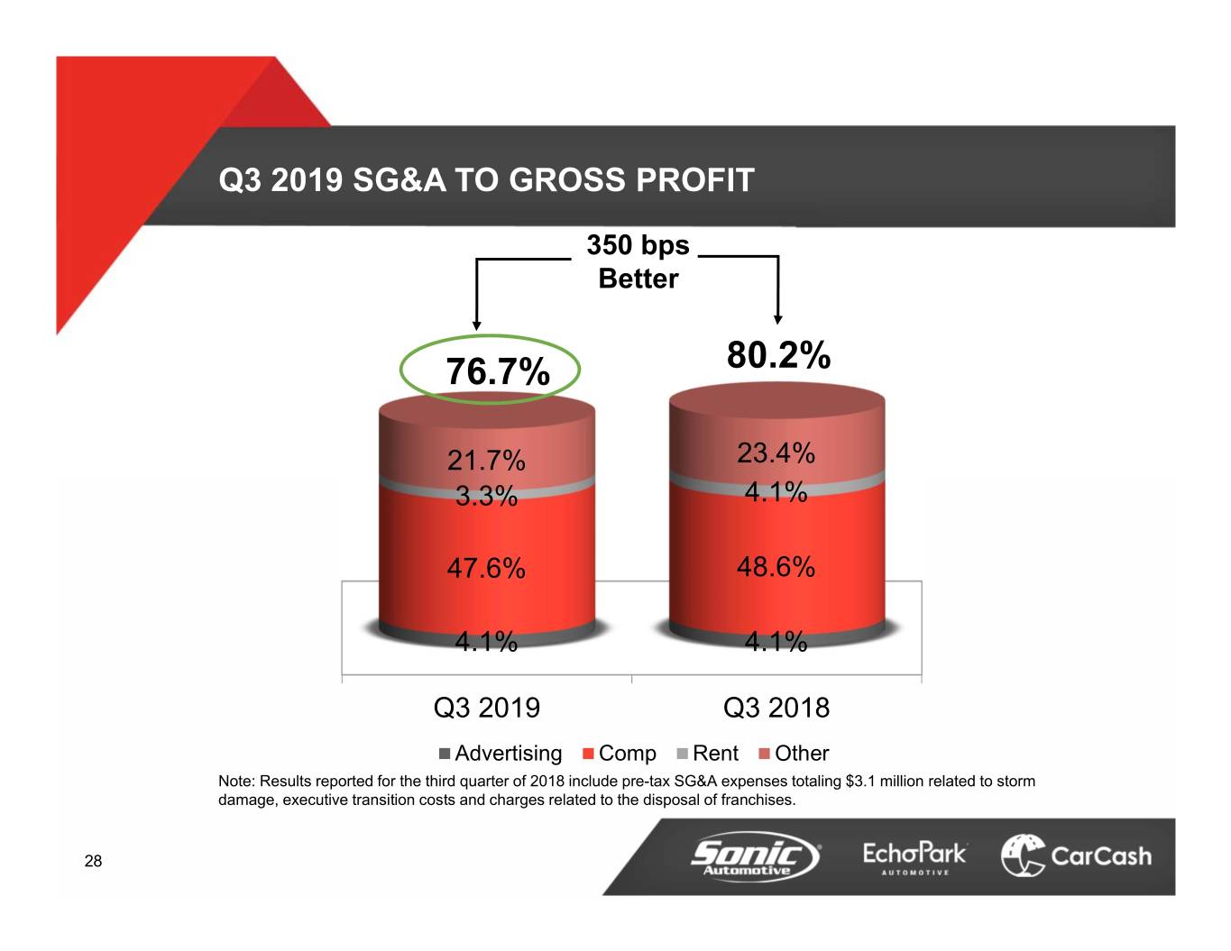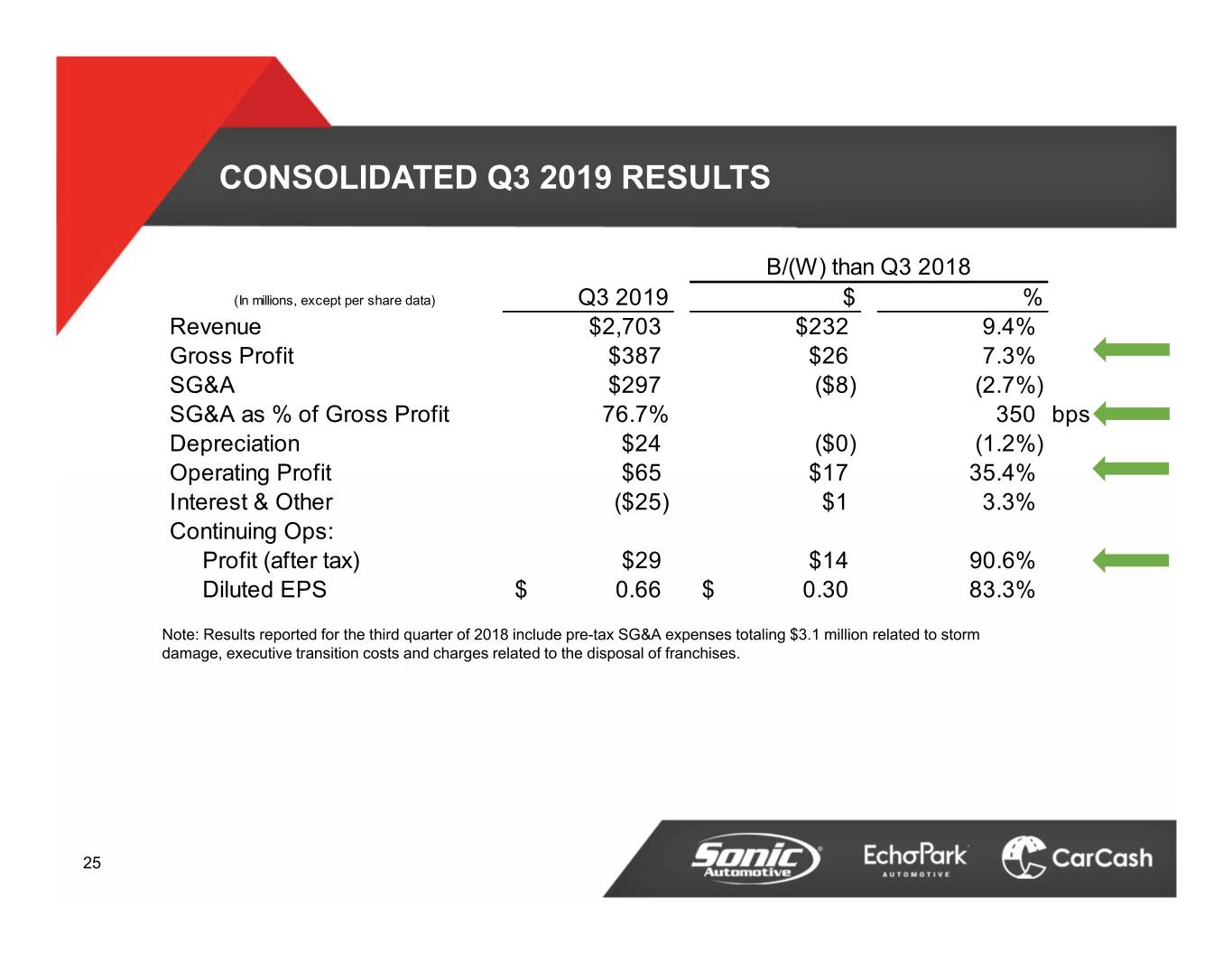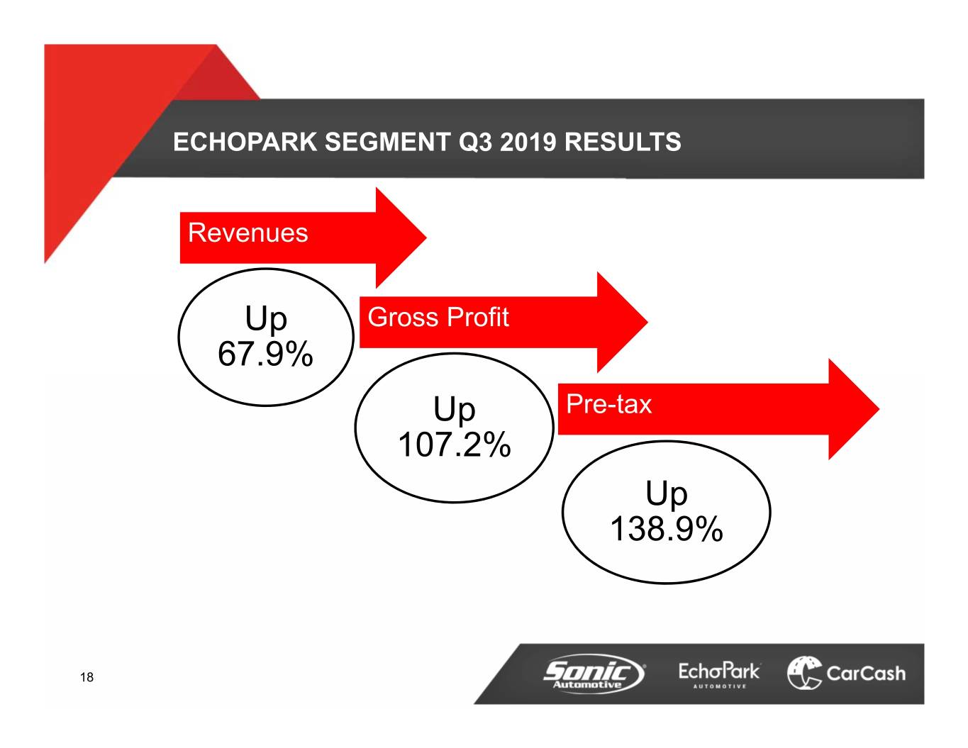 ECHOPARK SEGMENT Q3 2019 RESULTS B/(W) than Q3 2018 (In millions, except unit and per unit data) Q3 2019 $ % Revenue $312.2 $126.3 67.9% Gross Profit $29.6 $15.3 107.2% SG&A $22.2 ($5.5) (33.1%) SG&A as % of Gross Profit 75.3% 4,200 bps Depreciation Expense $2.7 ($0.7) (35.3%) Operating Profit $3.5 $7.9 178.4% Interest & Other ($1.4) ($0.4) (35.6%) Pre-tax $2.1 $7.6 138.9% Retail Units 13,206 5,508 71.6% Total Front and F&I Gross per Unit Retailed $2,264 $471 26.2% 19