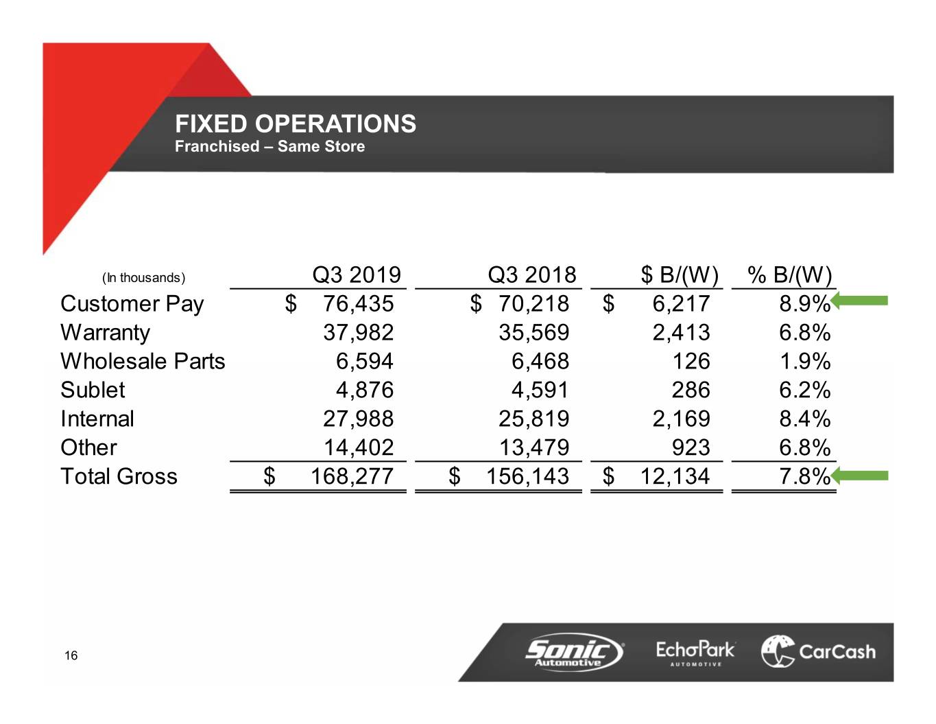FIXED OPERATIONS Franchised – Same Store (In thousands) Q3 2019 Q3 2018 $ B/(W) % B/(W) Customer Pay$ 76,435 $ 70,218 $ 6,217 8.9% Warranty 37,982 35,569 2,413 6.8% Wholesale Parts 6,594 6,468 126 1.9% Sublet 4,876 4,591 286 6.2% Internal 27,988 25,819 2,169 8.4% Other 14,402 13,479 923 6.8% Total Gross$ 168,277 $ 156,143 $ 12,134 7.8% 16