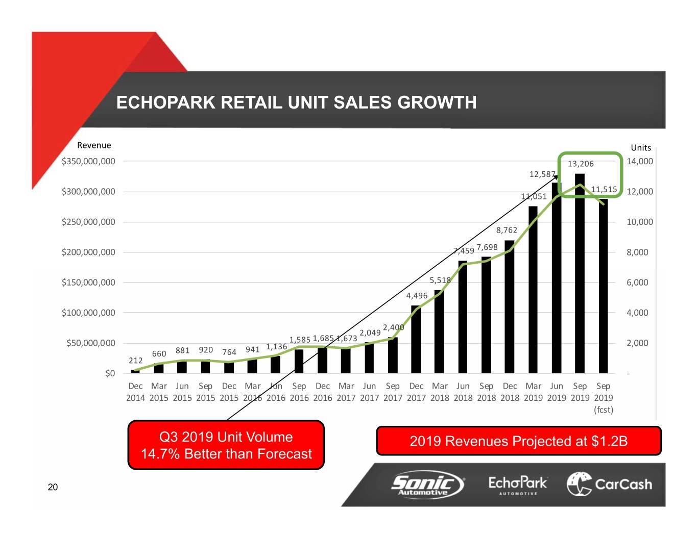 ECHOPARK RETAIL UNIT SALES GROWTH Revenue Units $350,000,000 13,206 14,000 12,587 11,515 $300,000,000 11,051 12,000 $250,000,000 10,000 8,762 7,698 $200,000,000 7,459 8,000 $150,000,000 5,518 6,000 4,496 $100,000,000 4,000 2,400 2,049 1,585 1,685 1,673 $50,000,000 1,136 2,000 660 881 920 764 941 212 $0 ‐ Dec Mar Jun Sep Dec Mar Jun Sep Dec Mar Jun Sep Dec Mar Jun Sep Dec Mar Jun Sep Sep 2014 2015 2015 2015 2015 2016 2016 2016 2016 2017 2017 2017 2017 2018 2018 2018 2018 2019 2019 2019 2019 (fcst) Q3 2019 Unit Volume 2019 Revenues Projected at $1.2B 14.7% Better than Forecast 20