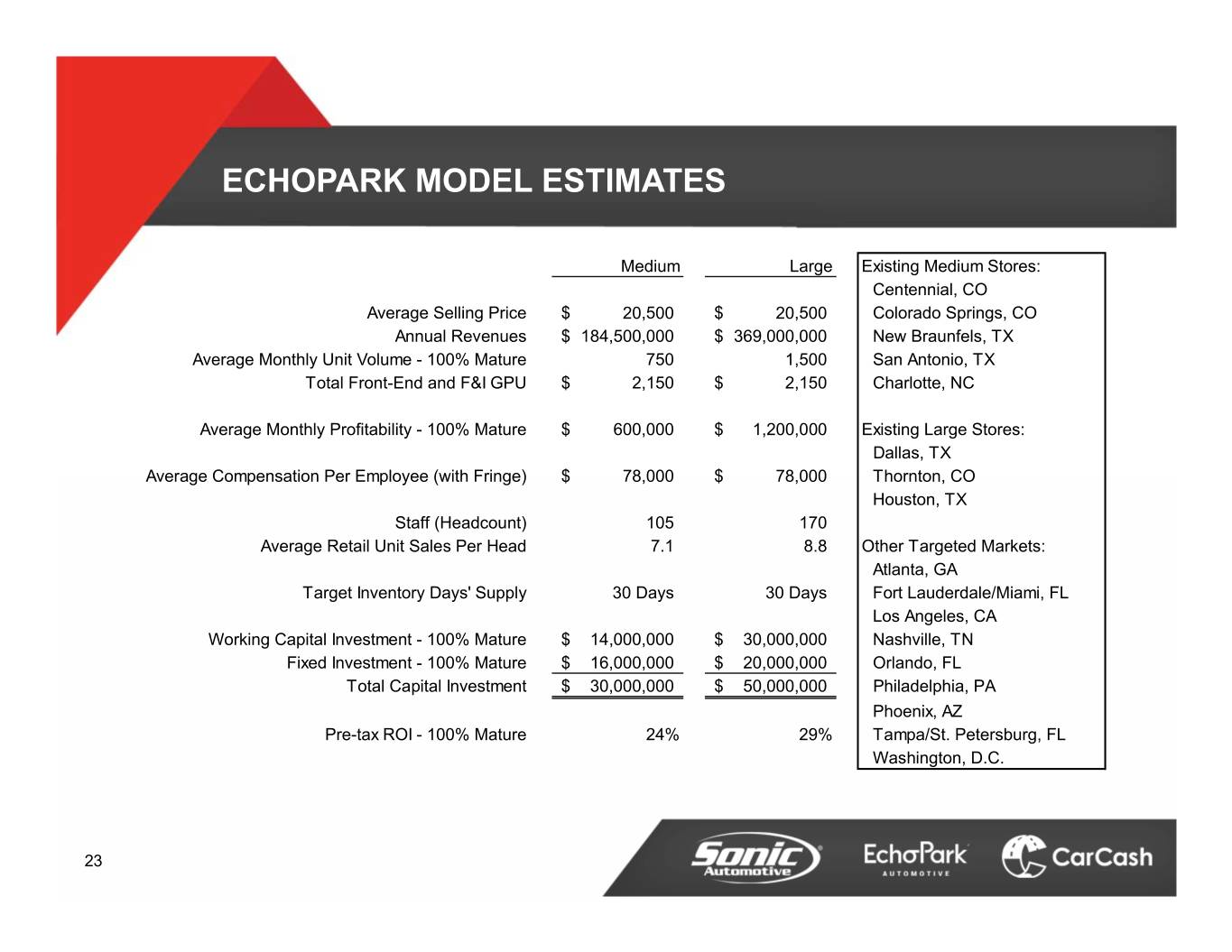 ECHOPARK MODEL ESTIMATES Medium Large Existing Medium Stores: Centennial, CO Average Selling Price$ 20,500 $ 20,500 Colorado Springs, CO Annual Revenues$ 184,500,000 $ 369,000,000 New Braunfels, TX Average Monthly Unit Volume - 100% Mature 750 1,500 San Antonio, TX Total Front-End and F&I GPU$ 2,150 $ 2,150 Charlotte, NC Average Monthly Profitability - 100% Mature$ 600,000 $ 1,200,000 Existing Large Stores: Dallas, TX Average Compensation Per Employee (with Fringe)$ 78,000 $ 78,000 Thornton, CO Houston, TX Staff (Headcount) 105 170 Average Retail Unit Sales Per Head 7.1 8.8 Other Targeted Markets: Atlanta, GA Target Inventory Days' Supply 30 Days 30 Days Fort Lauderdale/Miami, FL Los Angeles, CA Working Capital Investment - 100% Mature$ 14,000,000 $ 30,000,000 Nashville, TN Fixed Investment - 100% Mature$ 16,000,000 $ 20,000,000 Orlando, FL Total Capital Investment$ 30,000,000 $ 50,000,000 Philadelphia, PA Phoenix, AZ Pre-tax ROI - 100% Mature 24% 29% Tampa/St. Petersburg, FL Washington, D.C. 23