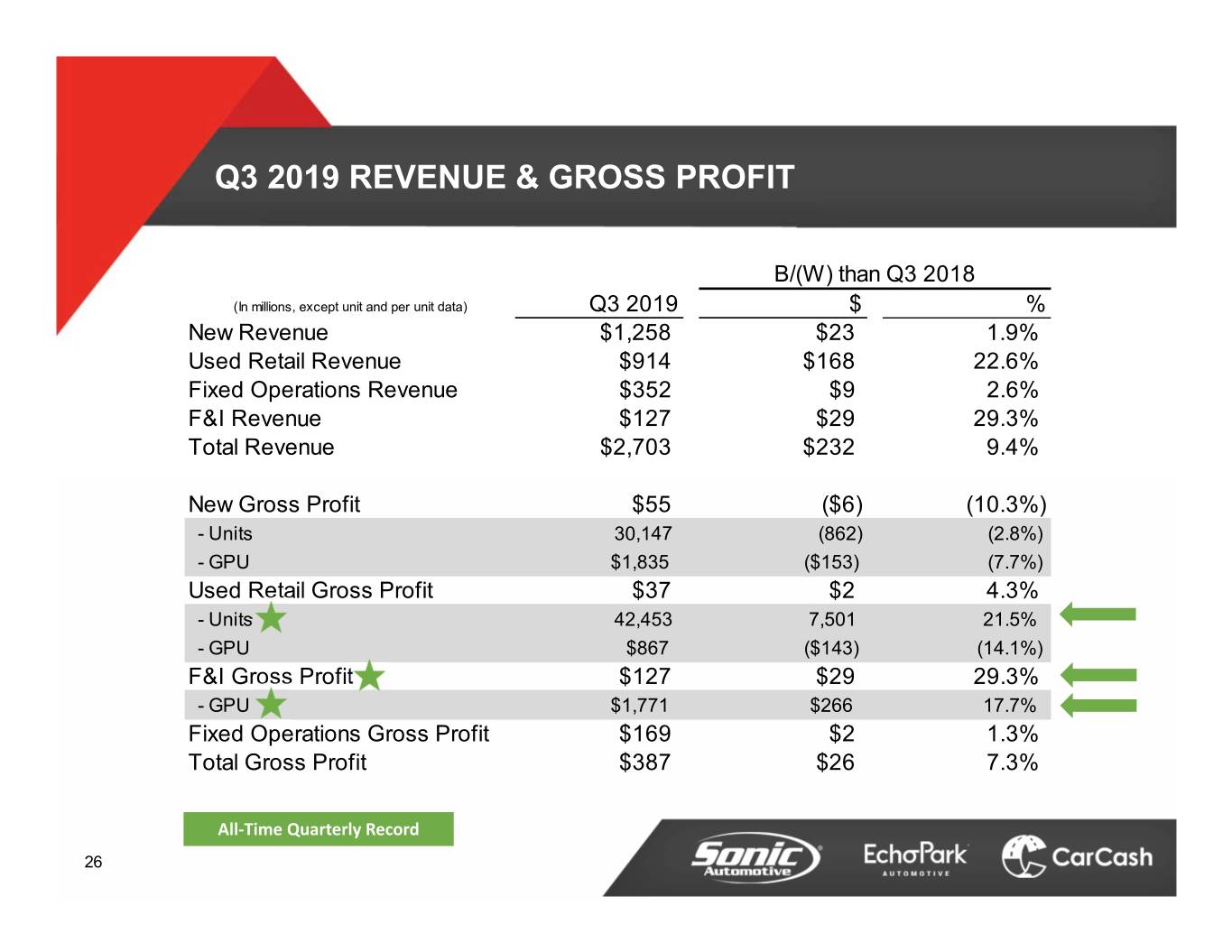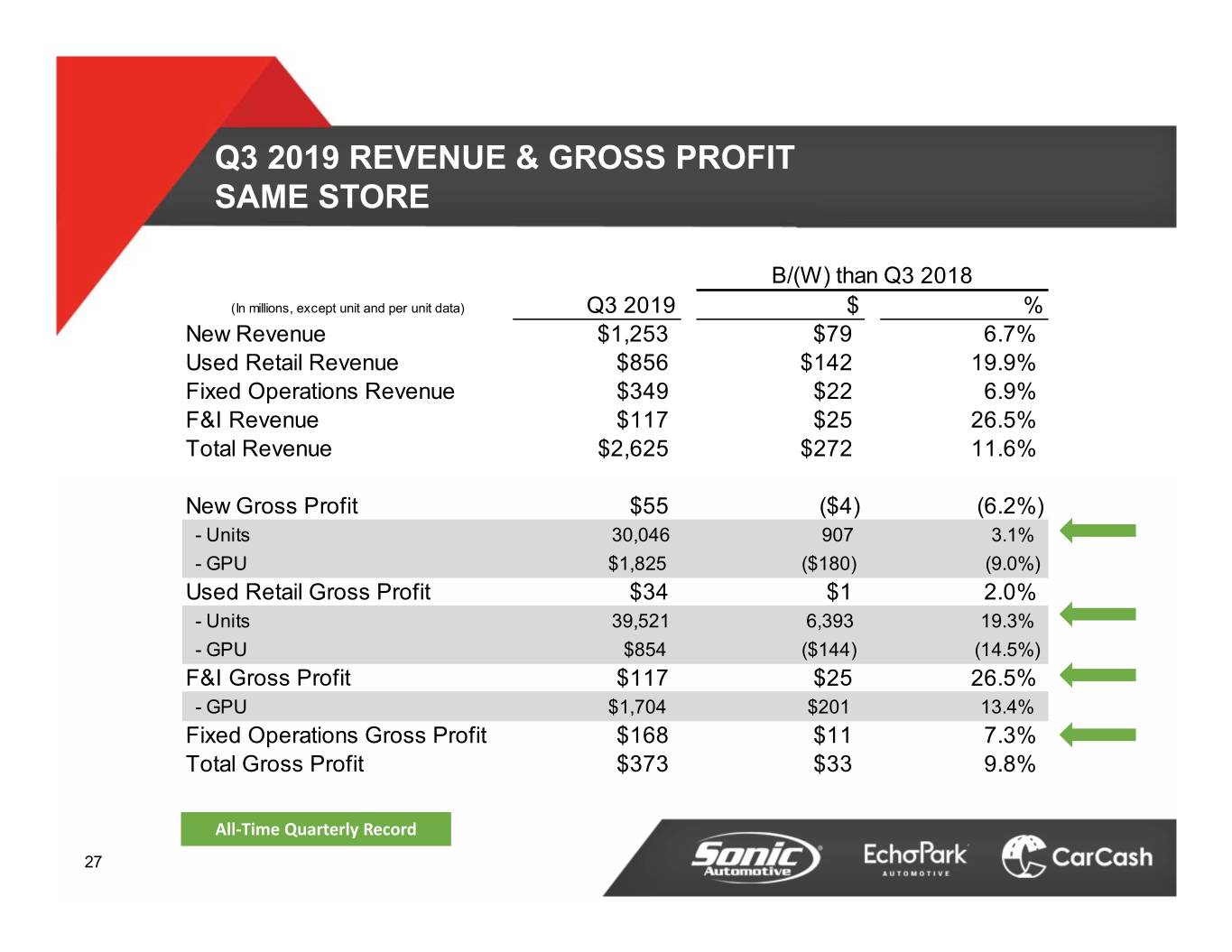 Q3 2019 REVENUE & GROSS PROFIT B/(W) than Q3 2018 (In millions, except unit and per unit data) Q3 2019 $ % New Revenue $1,258 $23 1.9% Used Retail Revenue $914 $168 22.6% Fixed Operations Revenue $352 $9 2.6% F&I Revenue $127 $29 29.3% Total Revenue $2,703 $232 9.4% New Gross Profit $55 ($6) (10.3%) - Units 30,147 (862) (2.8%) - GPU $1,835 ($153) (7.7%) Used Retail Gross Profit $37 $2 4.3% - Units 42,453 7,501 21.5% - GPU $867 ($143) (14.1%) F&I Gross Profit $127 $29 29.3% - GPU $1,771 $266 17.7% Fixed Operations Gross Profit $169 $2 1.3% Total Gross Profit $387 $26 7.3% All‐Time Quarterly Record 26