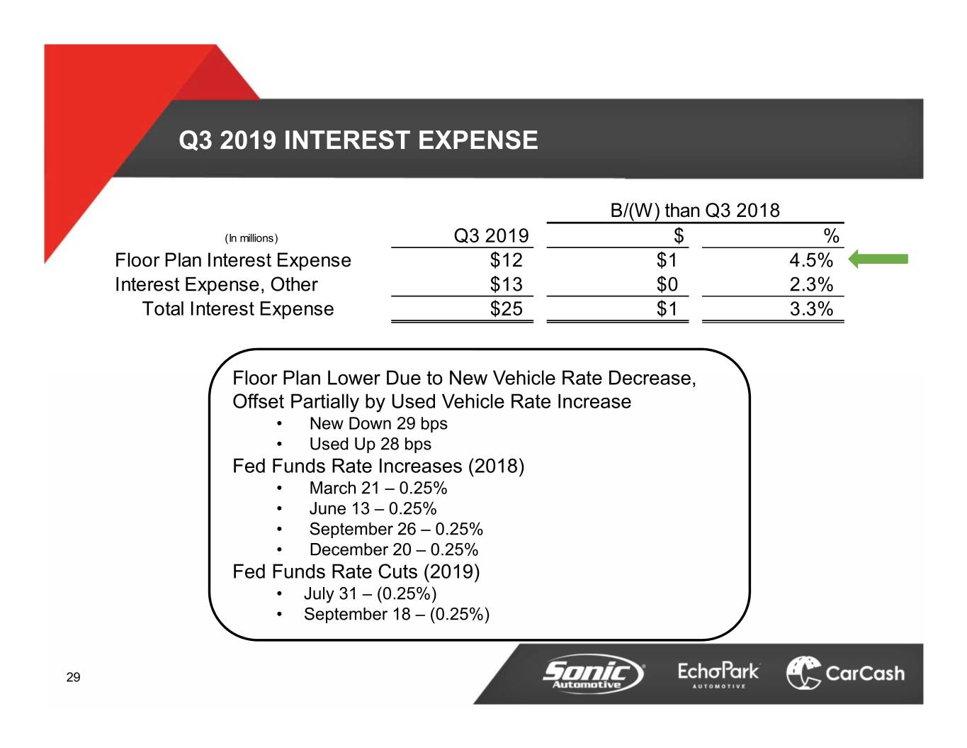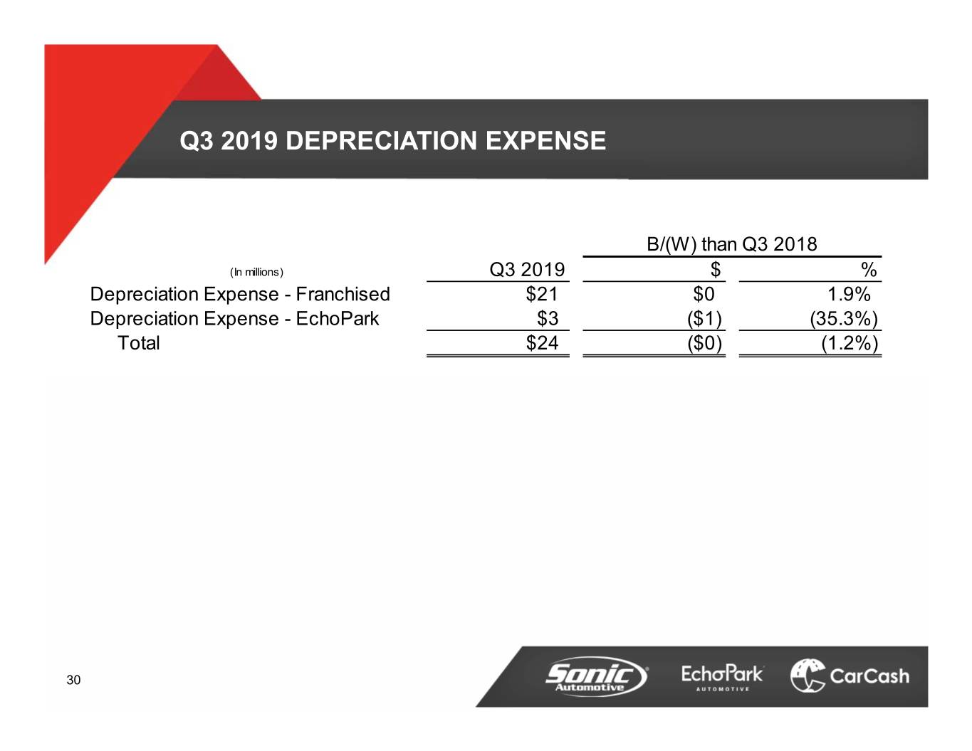 Q3 2019 DEPRECIATION EXPENSE B/(W) than Q3 2018 (In millions) Q3 2019 $ % Depreciation Expense - Franchised $21 $0 1.9% Depreciation Expense - EchoPark $3 ($1) (35.3%) Total $24 ($0) (1.2%) 30