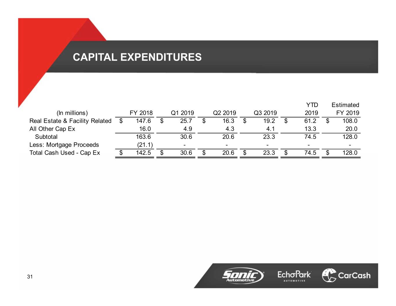 CAPITAL EXPENDITURES YTD Estimated (In millions) FY 2018 Q1 2019 Q2 2019 Q3 2019 2019 FY 2019 Real Estate & Facility Related$ 147.6 $ 25.7 $ 16.3 $ 19.2 $ 61.2 $ 108.0 All Other Cap Ex 16.0 4.9 4.3 4.1 13.3 20.0 Subtotal 163.6 30.6 20.6 23.3 74.5 128.0 Less: Mortgage Proceeds (21.1) - - - - - Total Cash Used - Cap Ex$ 142.5 $ 30.6 $ 20.6 $ 23.3 $ 74.5 $ 128.0 31