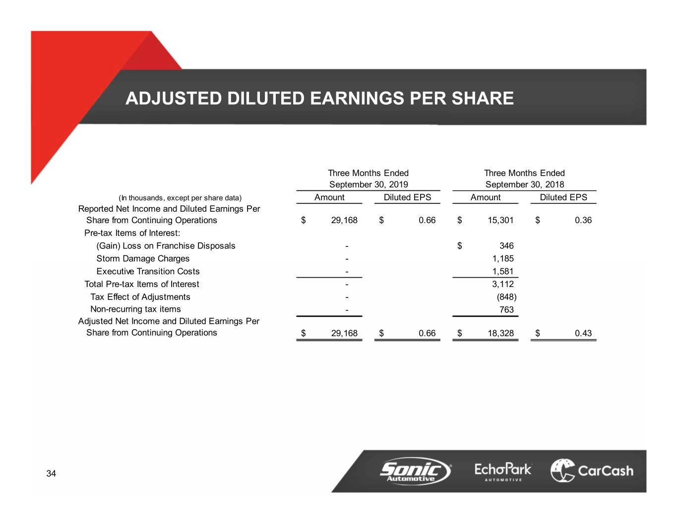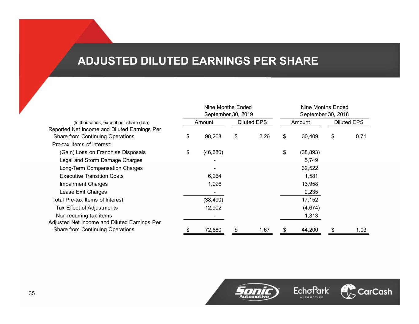ADJUSTED DILUTED EARNINGS PER SHARE Three Months Ended Three Months Ended September 30, 2019 September 30, 2018 (In thousands, except per share data) Amount Diluted EPS Amount Diluted EPS Reported Net Income and Diluted Earnings Per Share from Continuing Operations$ 29,168 $ 0.66 $ 15,301 $ 0.36 Pre-tax Items of Interest: (Gain) Loss on Franchise Disposals - $ 346 Storm Damage Charges - 1,185 Executive Transition Costs - 1,581 Total Pre-tax Items of Interest - 3,112 Tax Effect of Adjustments - (848) Non-recurring tax items - 763 Adjusted Net Income and Diluted Earnings Per Share from Continuing Operations $ 29,168 $ 0.66 $ 18,328 $ 0.43 34