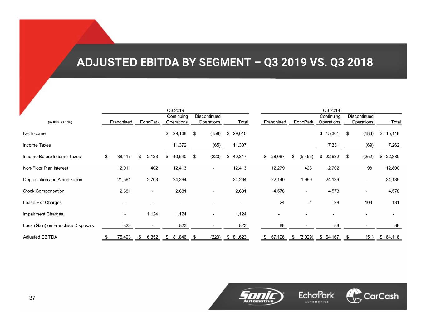 ADJUSTED EBITDA BY SEGMENT – Q3 2019 VS. Q3 2018 Q3 2019 Q3 2018 Continuing Discontinued Continuing Discontinued (In thousands) Franchised EchoPark Operations Operations Total Franchised EchoPark Operations Operations Total Net Income$ 29,168 $ (158) $ 29,010 $ 15,301 $ (183) $ 15,118 Income Taxes 11,372 (65) 11,307 7,331 (69) 7,262 Income Before Income Taxes$ 38,417 $ 2,123 $ 40,540 $ (223) $ 40,317 $ 28,087 $ (5,455) $ 22,632 $ (252) $ 22,380 Non-Floor Plan Interest 12,011 402 12,413 - 12,413 12,279 423 12,702 98 12,800 Depreciation and Amortization 21,561 2,703 24,264 - 24,264 22,140 1,999 24,139 - 24,139 Stock Compensation 2,681 - 2,681 - 2,681 4,578 - 4,578 - 4,578 Lease Exit Charges - - - - - 24 4 28 103 131 Impairment Charges - 1,124 1,124 - 1,124 - - - - - Loss (Gain) on Franchise Disposals 823 - 823 - 823 88 - 88 - 88 Adjusted EBITDA$ 75,493 $ 6,352 $ 81,846 $ (223) $ 81,623 $ 67,196 $ (3,029) $ 64,167 $ (51) $ 64,116 37