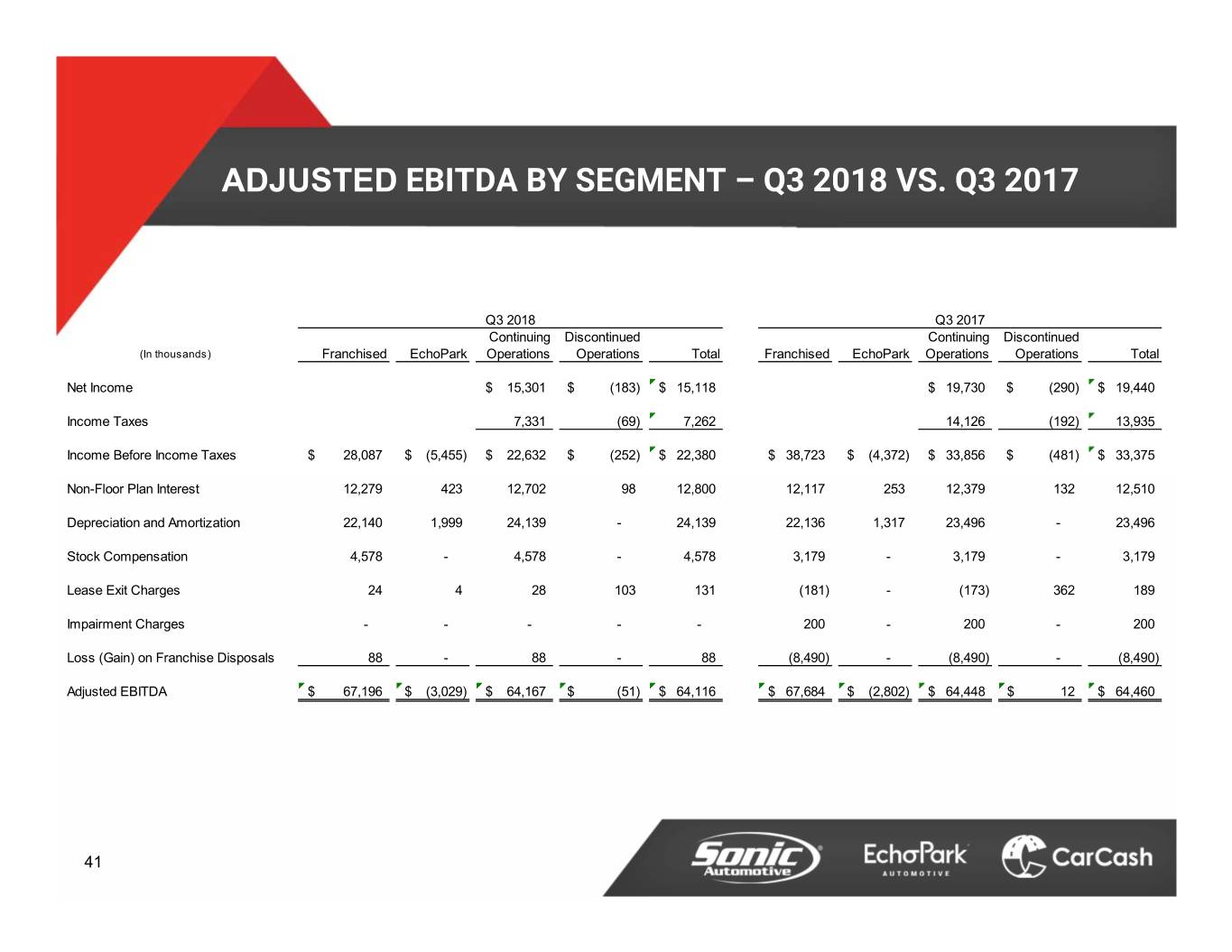 ADJUSTED EBITDA BY SEGMENT – Q4 2018 VS. Q4 2017 Q4 2018 Q4 2017 Continuing Discontinued Continuing Discontinued (In thousands) Franchised EchoPark Operations Operations Total Franchised EchoPark Operations Operations Total Net Income$ 21,981 $ (161) $ 21,820 $ 62,128 $ (176) $ 61,952 Income Taxes 9,212 (60) 9,152 (8,283) (116) (8,399) Income Before Income Taxes$ 37,388 $ (6,195) $ 31,192 $ (221) $ 30,971 $ 58,441 $ (3,976) $ 53,846 $ (293) $ 53,553 Non-Floor Plan Interest 12,902 423 13,325 89 13,414 12,441 276 12,725 123 12,847 Depreciation and Amortization 21,087 2,210 23,297 - 23,297 22,598 1,314 23,953 - 23,953 Stock Compensation 1,264 - 1,264 - 1,264 2,217 - 2,217 - 2,217 Lease Exit Charges (1,080) 4 (1,077) 89 (987) 16 - 23 118 141 Impairment Charges 14,053 1,500 15,553 - 15,553 5,890 - 6,079 - 6,079 Loss (Gain) on Debt Extinguishment - - - - - - - - - - Long-Term Compensation Charges - - - - - - 1,271 1,271 - 1,271 Loss (Gain) on Franchise Disposals (158) - (158) - (158) (1,507) - (1,507) (6) (1,513) Adjusted EBITDA$ 85,456 $ (2,059) $ 83,397 $ (43) $ 83,355 $ 100,095 $ (1,115) $ 98,605 $ (58) $ 98,548 40