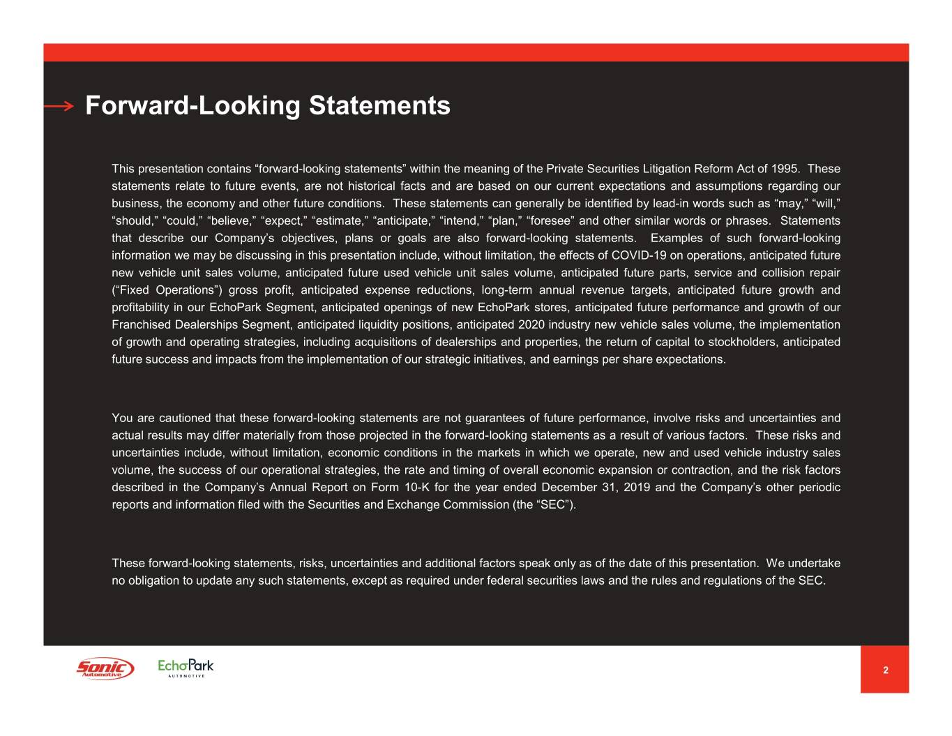 Forward-Looking Statements This presentation contains “forward-looking statements” within the meaning of the Private Securities Litigation Reform Act of 1995. These statements relate to future events, are not historical facts and are based on our current expectations and assumptions regarding our business, the economy and other future conditions. These statements can generally be identified by lead-in words such as “may,” “will,” “should,” “could,” “believe,” “expect,” “estimate,” “anticipate,” “intend,” “plan,” “foresee” and other similar words or phrases. Statements that describe our Company’s objectives, plans or goals are also forward-looking statements. Examples of such forward-looking information we may be discussing in this presentation include, without limitation, the effects of COVID-19 on operations, anticipated future new vehicle unit sales volume, anticipated future used vehicle unit sales volume, anticipated future parts, service and collision repair (“Fixed Operations”) gross profit, anticipated expense reductions, long-term annual revenue targets, anticipated future growth and profitability in our EchoPark Segment, anticipated openings of new EchoPark stores, anticipated future performance and growth of our Franchised Dealerships Segment, anticipated liquidity positions, anticipated 2020 industry new vehicle sales volume, the implementation of growth and operating strategies, including acquisitions of dealerships and properties, the return of capital to stockholders, anticipated future success and impacts from the implementation of our strategic initiatives, and earnings per share expectations. You are cautioned that these forward-looking statements are not guarantees of future performance, involve risks and uncertainties and actual results may differ materially from those projected in the forward-looking statements as a result of various factors. These risks and uncertainties include, without limitation, economic conditions in the markets in which we operate, new and used vehicle industry sales volume, the success of our operational strategies, the rate and timing of overall economic expansion or contraction, and the risk factors described in the Company’s Annual Report on Form 10-K for the year ended December 31, 2019 and the Company’s other periodic reports and information filed with the Securities and Exchange Commission (the “SEC”). These forward-looking statements, risks, uncertainties and additional factors speak only as of the date of this presentation. We undertake no obligation to update any such statements, except as required under federal securities laws and the rules and regulations of the SEC. 2