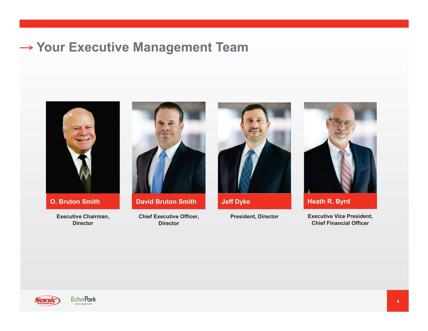 Your Executive Management Team O. Bruton Smith David Bruton Smith Jeff Dyke Heath R. Byrd Executive Chairman, Chief Executive Officer, President, Director Executive Vice President, Director Director Chief Financial Officer 4