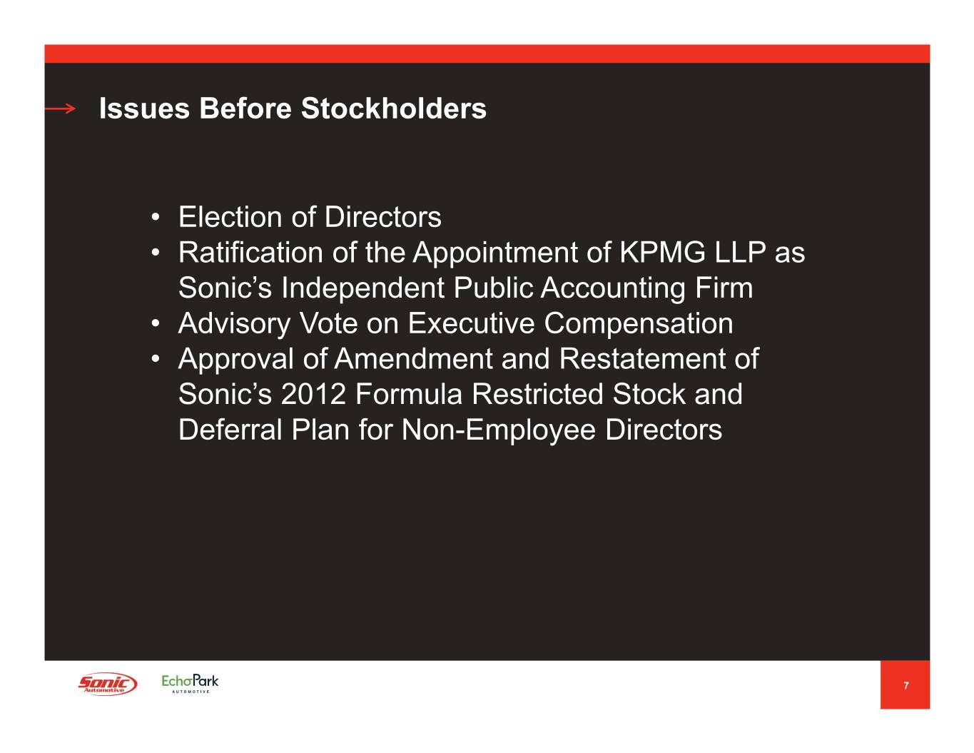 Issues Before Stockholders Election of Directors Ratification of the Appointment of KPMG LLP as Sonic’s Independent Public Accounting Firm Advisory Vote on Executive Compensation Approval of Amendment and Restatement of Sonic’s 2012 Formula Restricted Stock and Deferral Plan for Non-Employee Directors 7