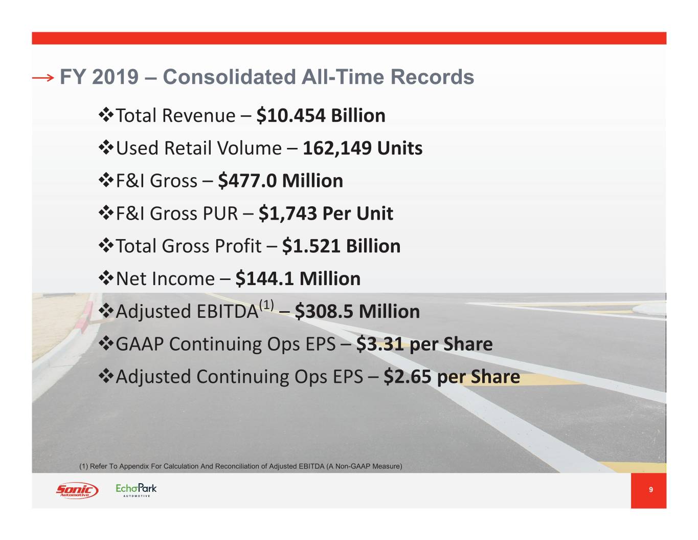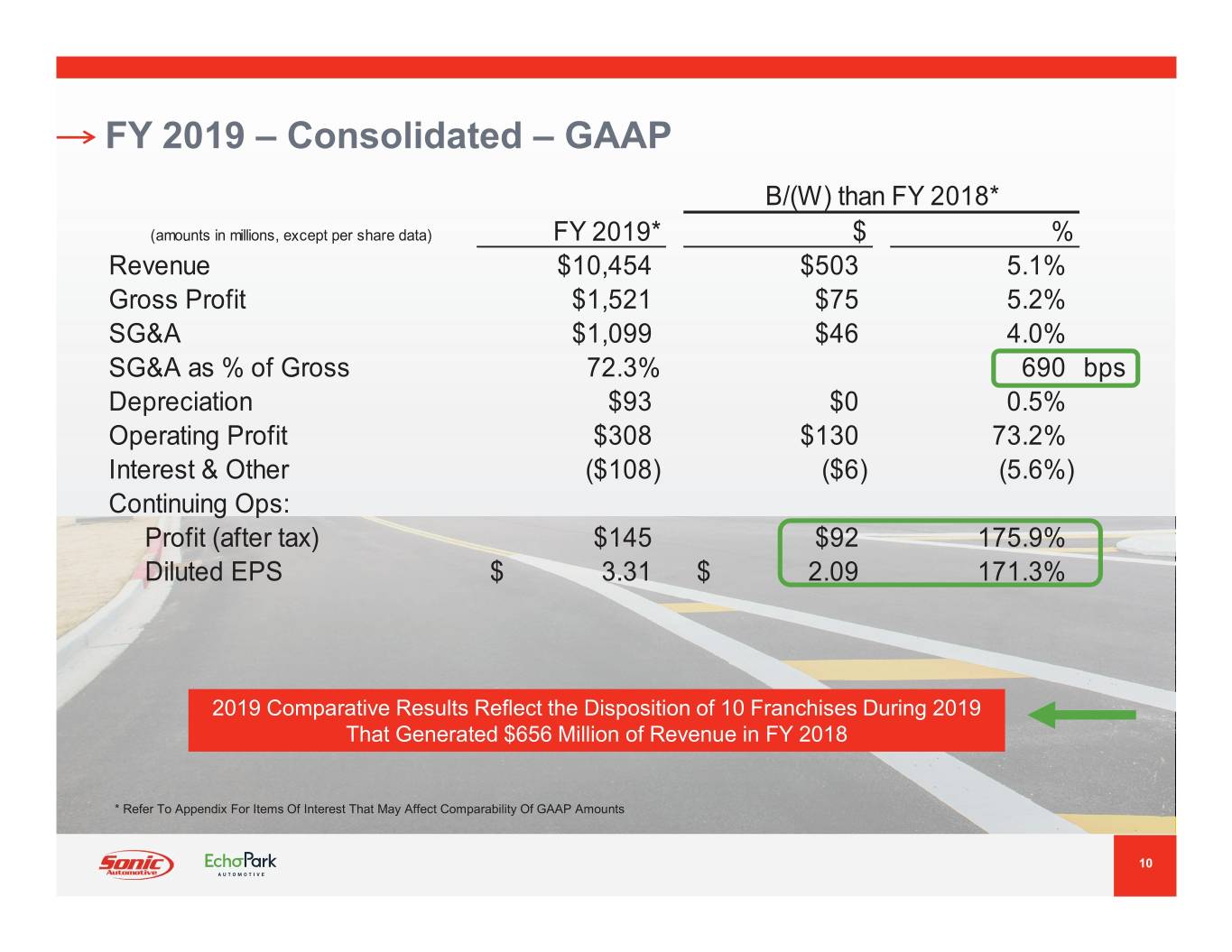 FY 2019 – Consolidated All-Time Records Total Revenue – $10.454 Billion Used Retail Volume – 162,149 Units F&I Gross – $477.0 Million F&I Gross PUR – $1,743 Per Unit Total Gross Profit – $1.521 Billion Net Income – $144.1 Million Adjusted EBITDA(1) – $308.5 Million GAAP Continuing Ops EPS – $3.31 per Share Adjusted Continuing Ops EPS – $2.65 per Share (1) Refer To Appendix For Calculation And Reconciliation of Adjusted EBITDA (A Non-GAAP Measure) 9