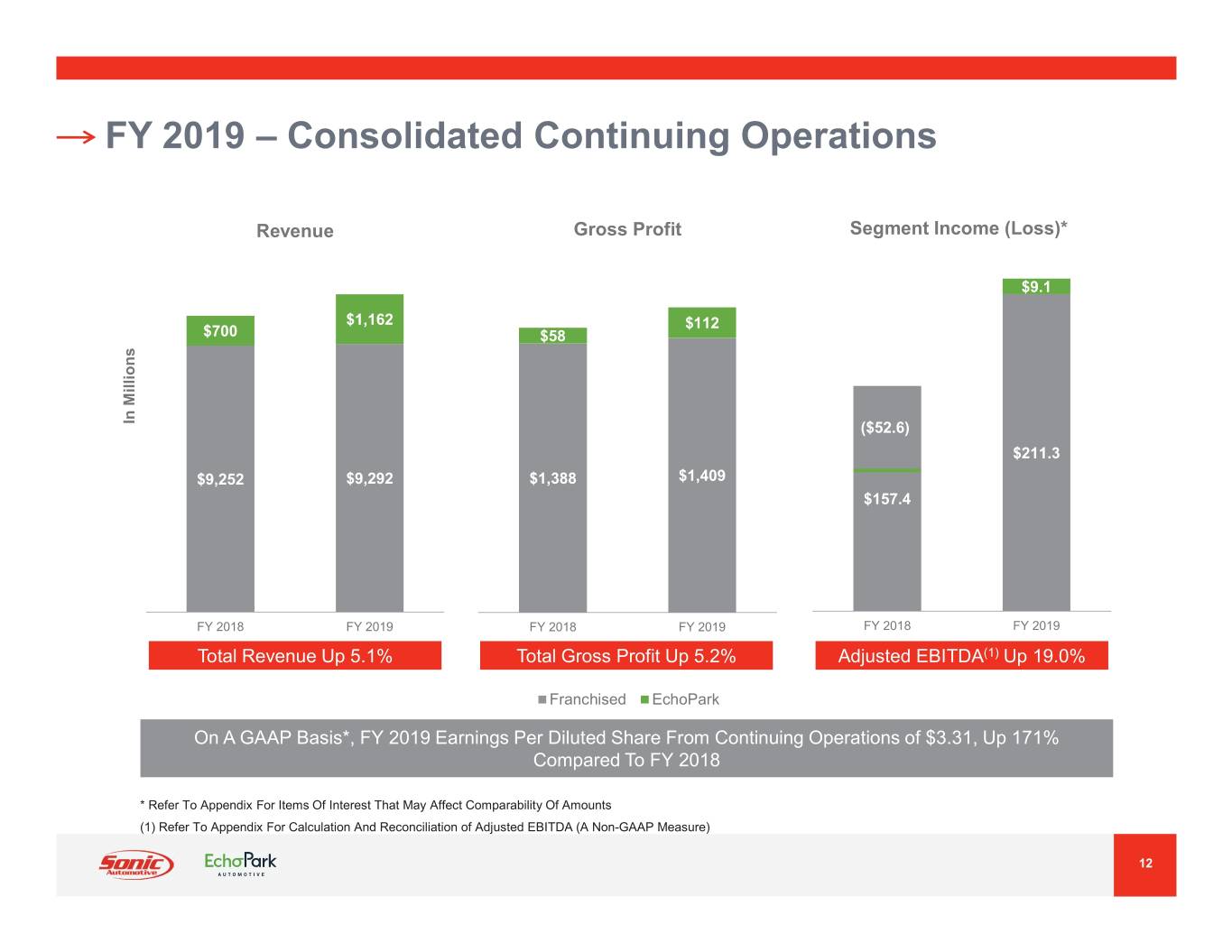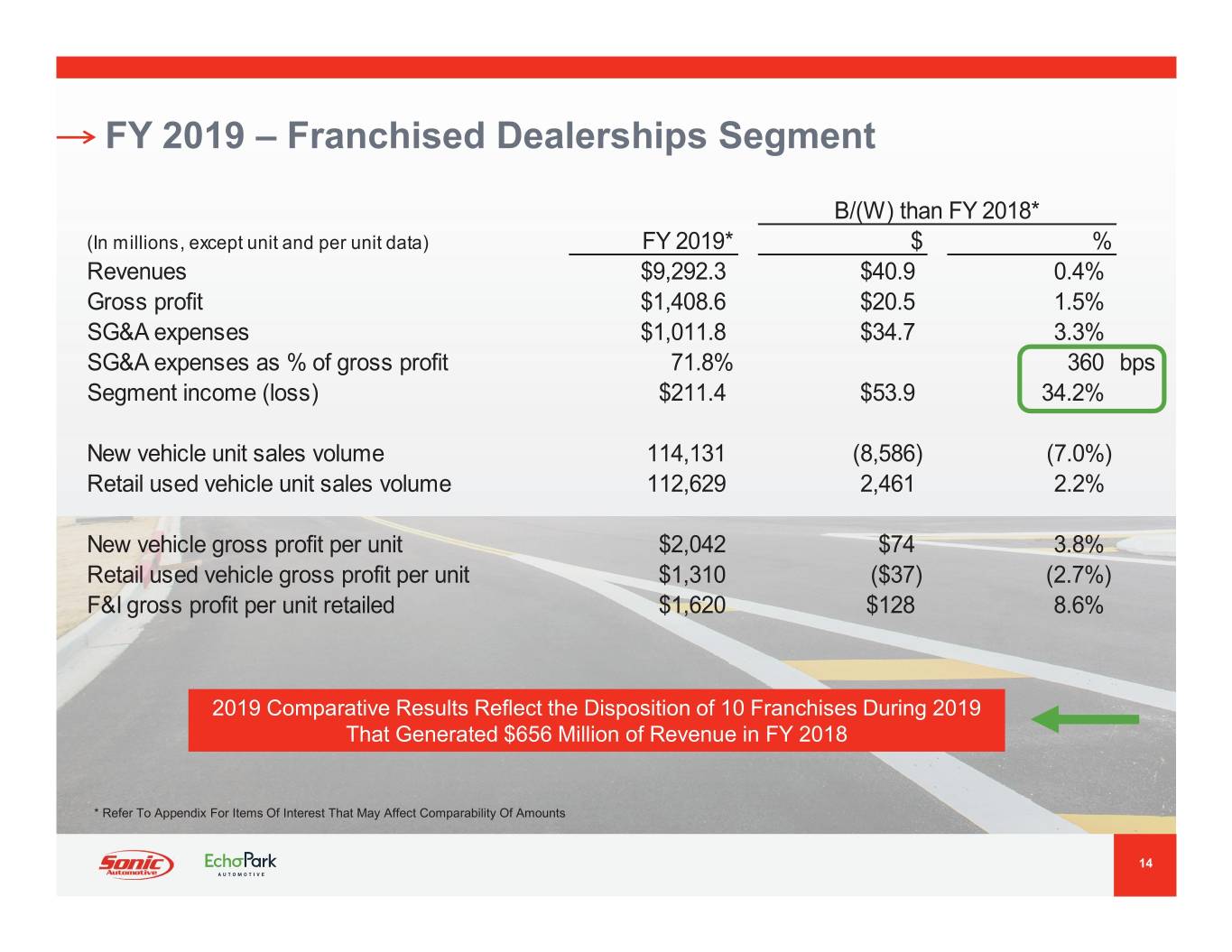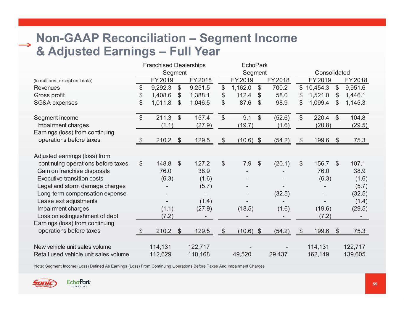Non-GAAP Reconciliation – Segment Income & Adjusted Earnings – Full Year Franchised Dealerships EchoPark Segment Segment Consolidated (In millions, except unit data) FY 2019 FY 2018 FY 2019 FY 2018 FY 2019 FY 2018 Revenues$ 9,292.3 $ 9,251.5 $ 1,162.0 $ 700.2 $ 10,454.3 $ 9,951.6 Gross profit$ 1,408.6 $ 1,388.1 $ 112.4 $ 58.0 $ 1,521.0 $ 1,446.1 SG&A expenses$ 1,011.8 $ 1,046.5 $ 87.6 $ 98.9 $ 1,099.4 $ 1,145.3 Segment income$ 211.3 $ 157.4 $ 9.1 $ (52.6) $ 220.4 $ 104.8 Impairment charges (1.1) (27.9) (19.7) (1.6) (20.8) (29.5) Earnings (loss) from continuing operations before taxes $ 210.2 $ 129.5 $ (10.6) $ (54.2) $ 199.6 $ 75.3 Adjusted earnings (loss) from continuing operations before taxes$ 148.8 $ 127.2 $ 7.9 $ (20.1) $ 156.7 $ 107.1 Gain on franchise disposals 76.0 38.9 - - 76.0 38.9 Executive transition costs (6.3) (1.6) - - (6.3) (1.6) Legal and storm damage charges - (5.7) - - - (5.7) Long-term compensation expense - - - (32.5) - (32.5) Lease exit adjustments - (1.4) - - - (1.4) Impairment charges (1.1) (27.9) (18.5) (1.6) (19.6) (29.5) Loss on extinguishment of debt (7.2) - - - (7.2) - Earnings (loss) from continuing operations before taxes $ 210.2 $ 129.5 $ (10.6) $ (54.2) $ 199.6 $ 75.3 New vehicle unit sales volume 114,131 122,717 - - 114,131 122,717 Retail used vehicle unit sales volume 112,629 110,168 49,520 29,437 162,149 139,605 Note: Segment Income (Loss) Defined As Earnings (Loss) From Continuing Operations Before Taxes And Impairment Charges 55